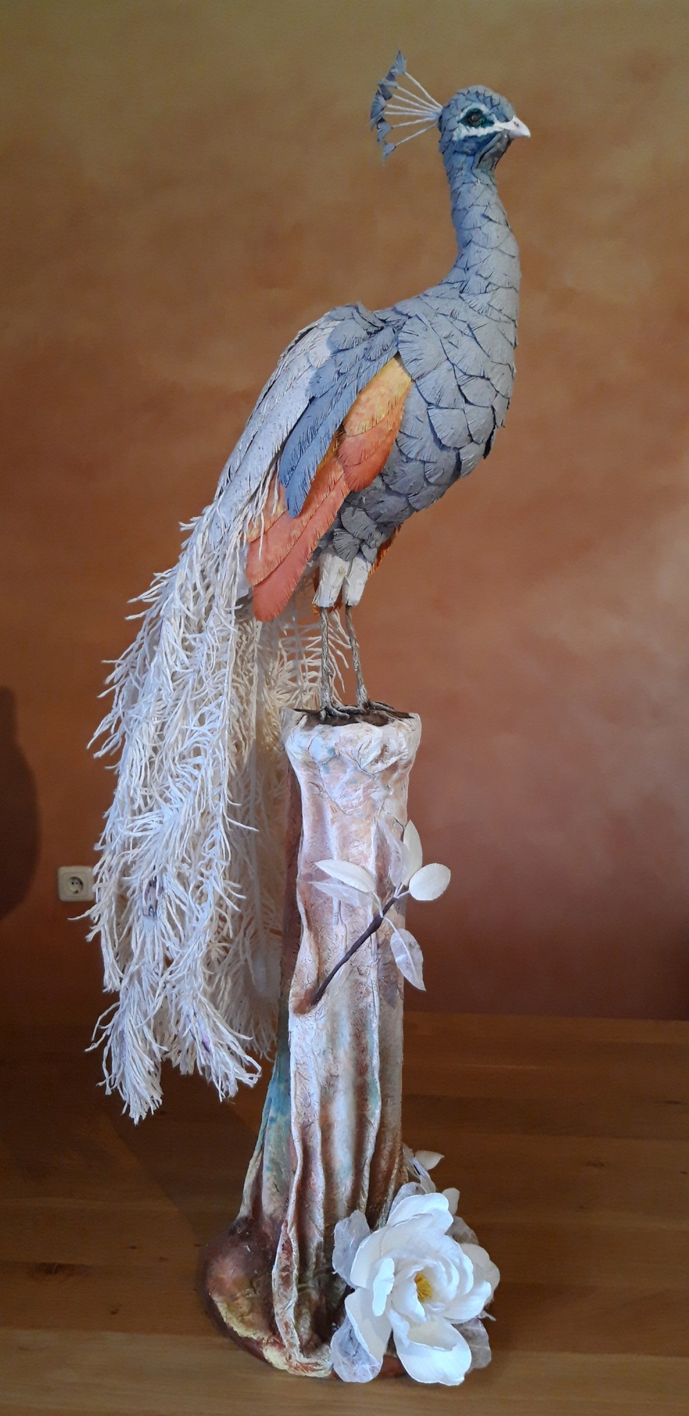 "Zo trots als een pauw" is een uitdrukking die we vaker moeten horen. Maar voor mij is "trots zijn " synoniem van dankbaarheid. Dankbaar voor de stad waar ik mag wonen, dankbaar voor het "thuis" die ik samen met mijn man heb mogen bouwen. Dankbaar voor de prachtige plekken in Apeldoorn en de omgeving die we mogen bewonderen. Deze pauw is aangekleed met die dankbaarheid en heeft in de veren van zijn staart kleine aquarelletjes van bekende/iconische plekken van Apeldoorn en de provincie Gelderland. Deze pauw is van papier gemaakt behalve de ronde houten schijf waar de boomstam ( wel van papier) op staat die het hele beeld in stand houdt. IJzerdraad is ook gebruikt voor bepaalde onderdelen die wat kracht nodig hebben. Iedere veer die op het beeld zit is per stuk handgemaakt. Alleen in de staart heb ik 4 vierkante meters papier gebruikt ,die geknipt en gedraaid zijn om de bekende lange veren te maken. Waar het pauwoog van de staartveren zou zijn, heb ik aquarellen gemaakt van mooie gebouwen en landschappen van Gelderland. Het blauwe gedeelte van de veren is van spijkerbroek papier gemaakt