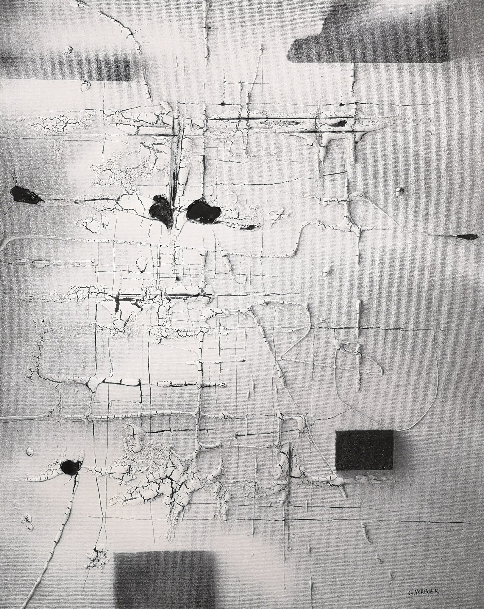 architectonische vormen in lyrisch abstracte schilderijen die gerelateerd zijn aan ( breuk)lijnen in het rots landschap van de Noord-Vogesen.