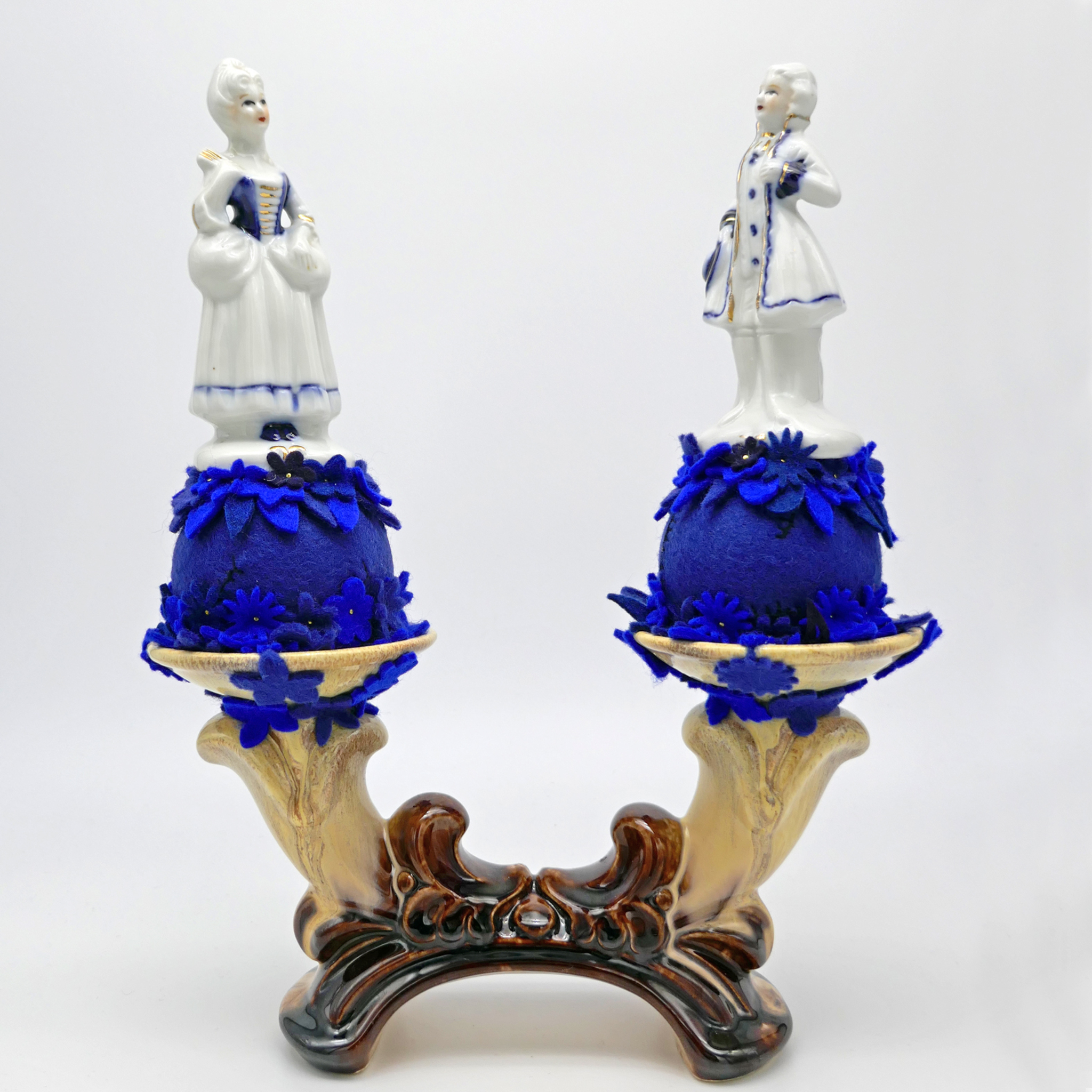 Deels handgeverfd wol vilt, keramiek, borduurzijde, foam, spelden.