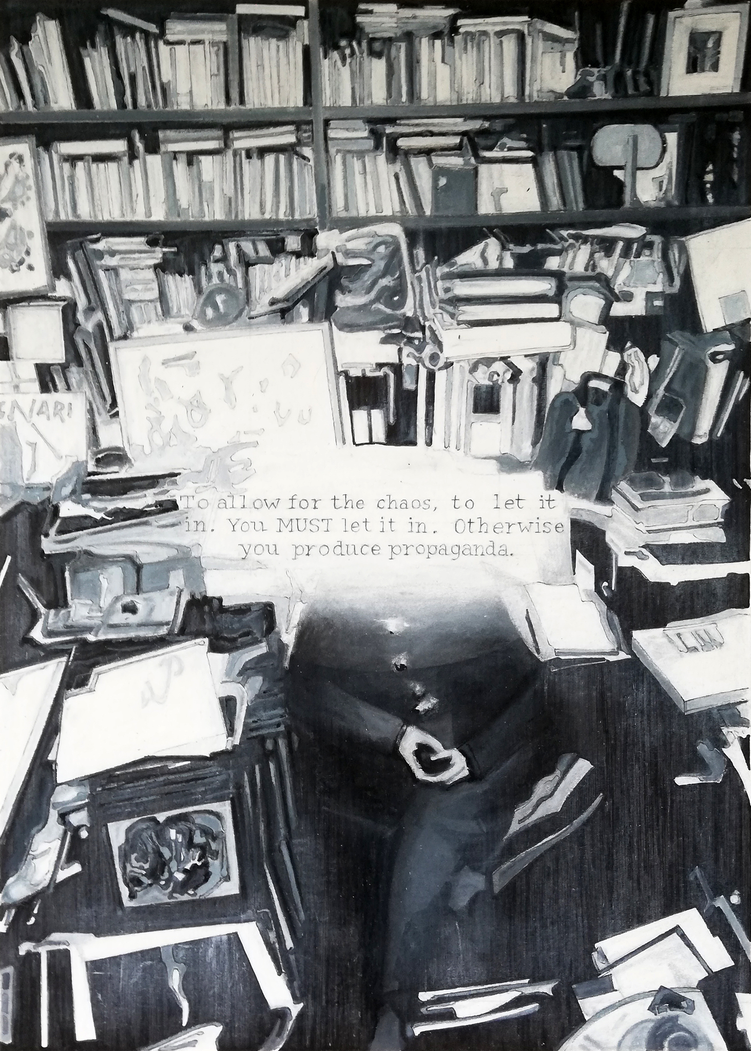 Een schrijver in zijn werkomgeving. Een kunstenaar en de omgeving waarin hij zijn werkt maakt beïnvloeden elkaar en vallen soms samen. De schrijver die hier tenmidden van boeken, platen, aantekeningen, tekeningen en naslagwerken zit is gebaseerd op een foto van de Japanse surrealistische dichter Shuzo Takiguchi. De tekst die over de witte plek die zijn hoofd verbergt geschreven is is niet van hem, maar is afkomstig uit het boek "I married a communist" van Philip Roth, die zich afspeelt ten tijde van de communistenjacht onder senator Joseph McCarthy. Shuzo Takiguchi is zelf acht maanden gevangen gezet door de Japanse "gedachtenpolitie" als gevolg van zijn contacten met de Franse surrealisten, waaronder André Breton.