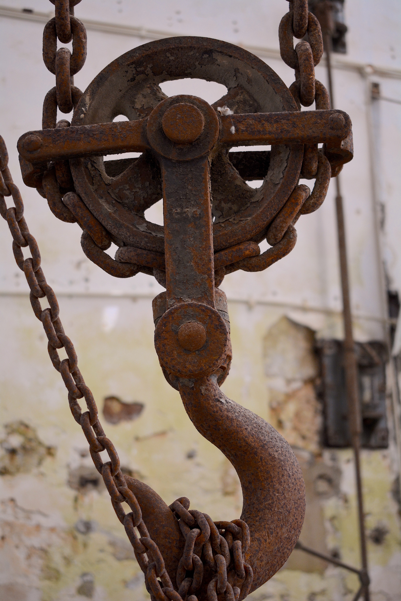 Ketting met haak van de grote kraanbaan in de historische metaalwerkplaats van de Curacao Mining Compagny Van deze foto worden maximaal 3 exemplaren in het formaat 82x119 cm op canvas geprint en gesigneerd. Het eerste exemplaar is verkocht