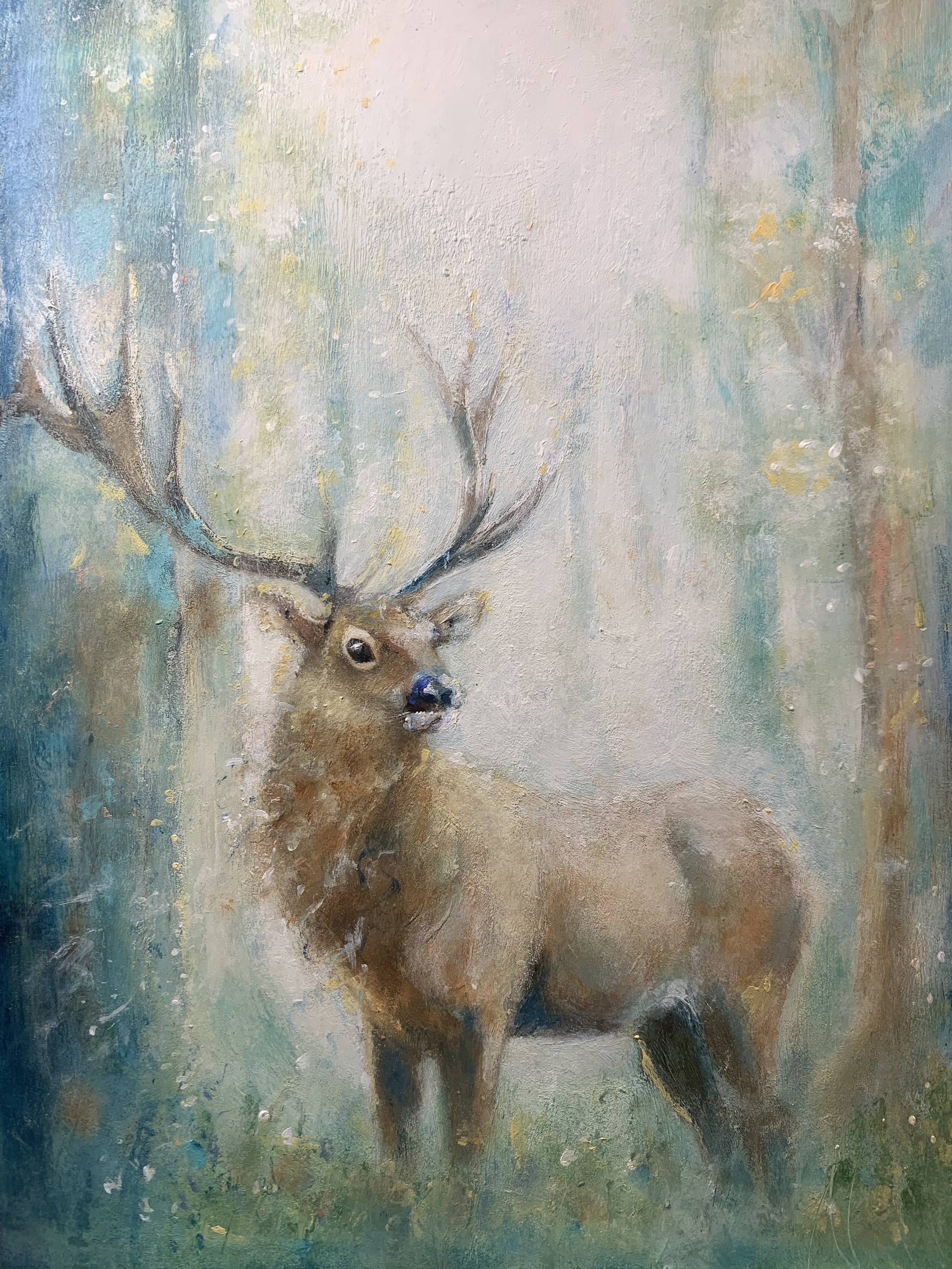 Hert. Bos, acryl op paneel Ook als kunstprint te bestellen