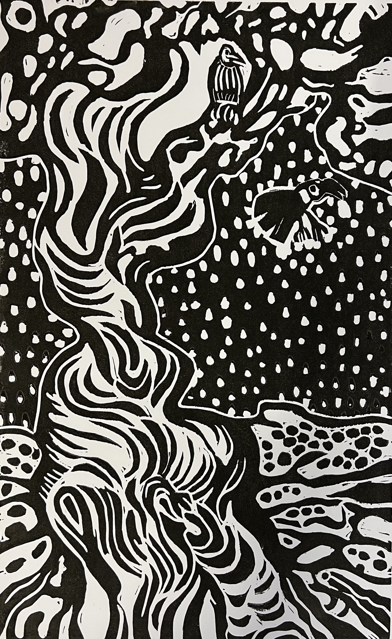 Deze linoleumsnede print is geinspireerd op een foto van een boom in het Schoorlse bos. De vogeltjes heb ik er in verwerkt omdat die altijd hoorbaar zijn. Deze afdruk in in zwart wit Tevens zijn er ook drukken met kleur (achtergrond).