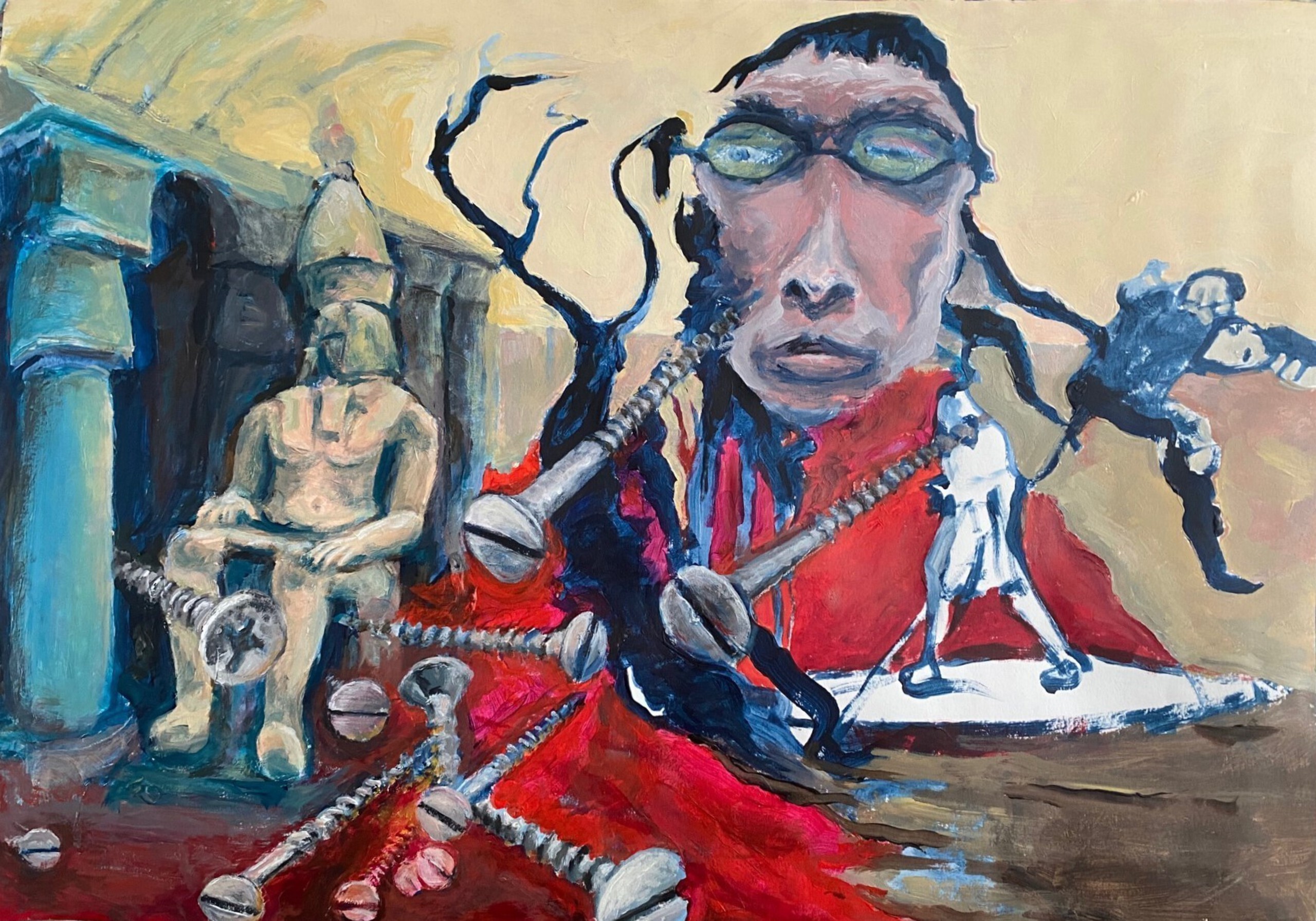 Raynold Bruessing, geboren in 1946 in Den Haag. Ik maak acrylschilderwerk op papier. Autodidact. Ik gebruik afbeeldingen op foto’s voor een verhalend resultaat met de verf.