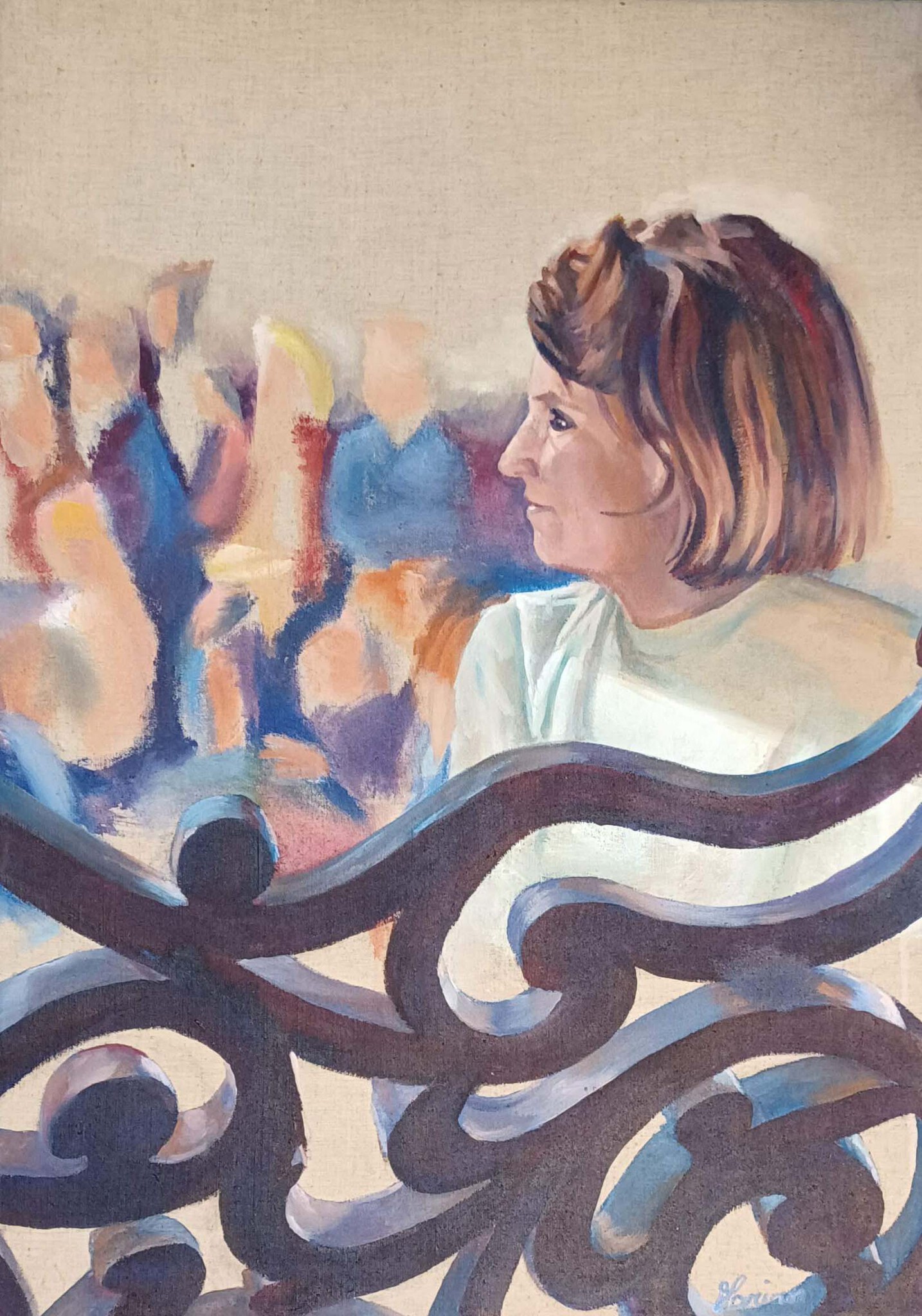 Ik heb de sfeer bij een optreden willen weergeven. Het gaat daarbij om de pianiste die achter de vleugel zit, daarom heb ik haar uitgewerkt. De vleugel heeft een prachtig gesneden houten muziekstandaard. Het linnen is zelf opgespannen en de structuur en kleur blijven op de achtergrond zichtbaar.