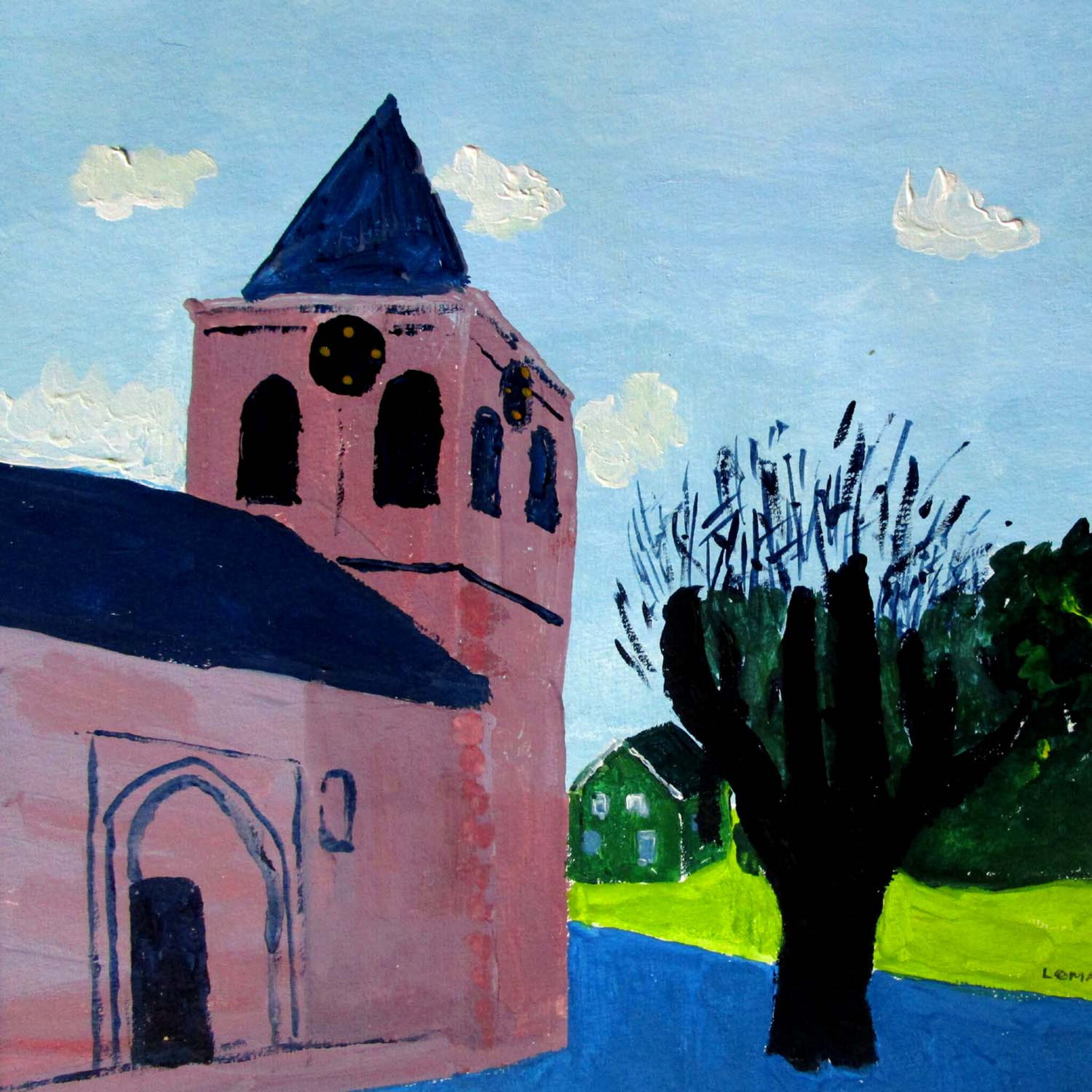 Geel Blauw Paars Groen Bruin Lucht Boom Kerk Toren Struiken