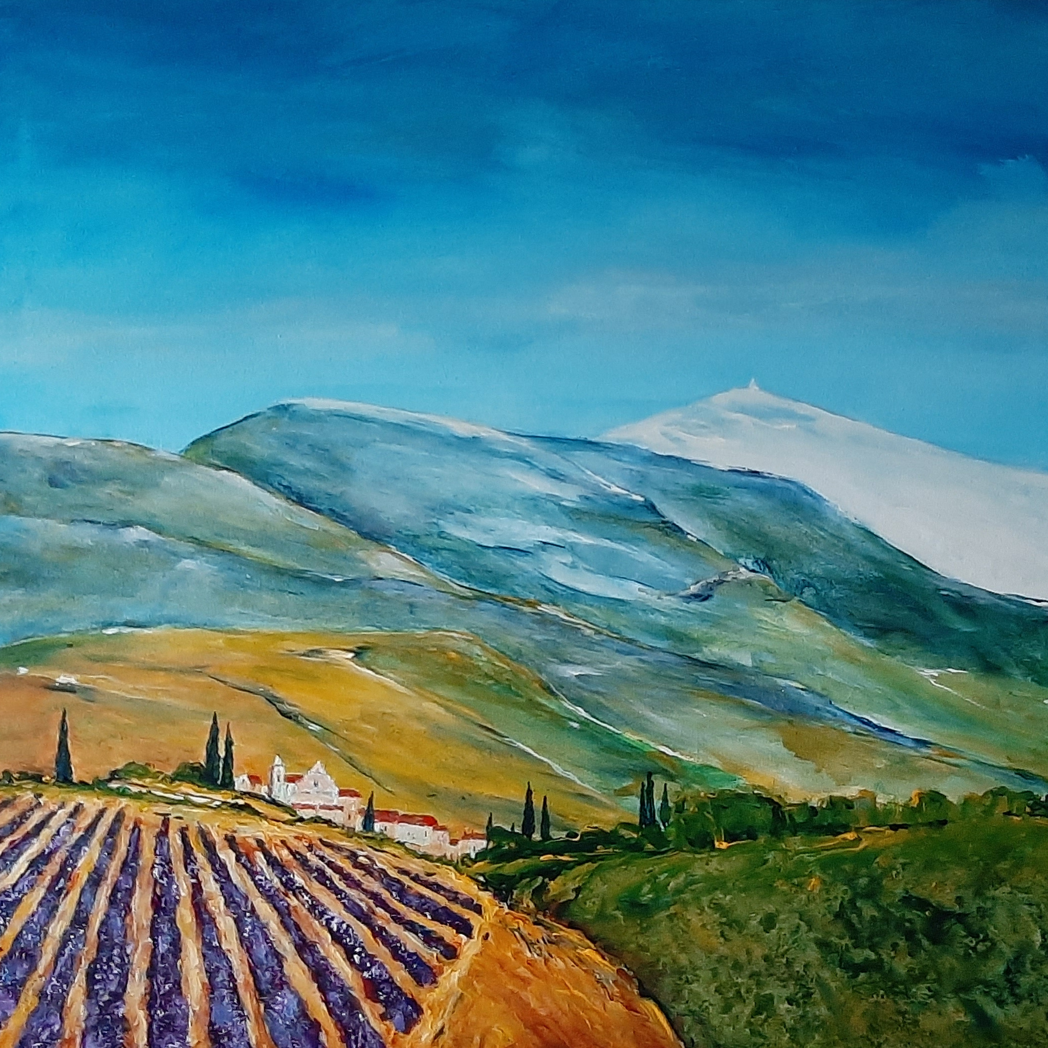 De Mont Ventoux (1912 m.) in de Franse Provence, op de grens van de departementen Drôme en Vaucluse, kent vanwege zijn mythische image veel andere benamingen. Zoals: de kale berg, de Reus van de Provence en het Suikerbrood. Maar de Franse toevoegen ‘Ventoux’ heeft ook alles te maken met het woord ‘vent’: wind. Een winderige berg, dus. Die benaming komt niet uit de lucht vallen. Wie ooit met een stevige ‘mistral’ (een koude noordenwind) per fiets door het witte maanlandschap heeft geploeterd, weet het maar al te goed. Zware windstoten met uitschieters tot 120 en 150 km/u zijn geen uitzondering. Het record staat zelfs op 320 km/u. Dat die wind zo tekeer kan gaan is niet verwonderlijk. De top van de Ventoux is alom tegenwoordig (‘omniprésent dans les paysages, zeggen de Fransen). Hij steekt hoog boven het land uit, en waar je ook bent in de Provence, altijd en overal kun je hem zien. Ik schilderde deze Ventoux een opdracht van een vriend, net als ik een fietsfanaat en bekend met de berg. Ik schilderde deze Mont Ventoux in een tijd van fysieke tegenslag, waarbij me fietsen tot nader order verboden werd. Het is het 12r werk in deze reeks, die ik in 2022 begon.