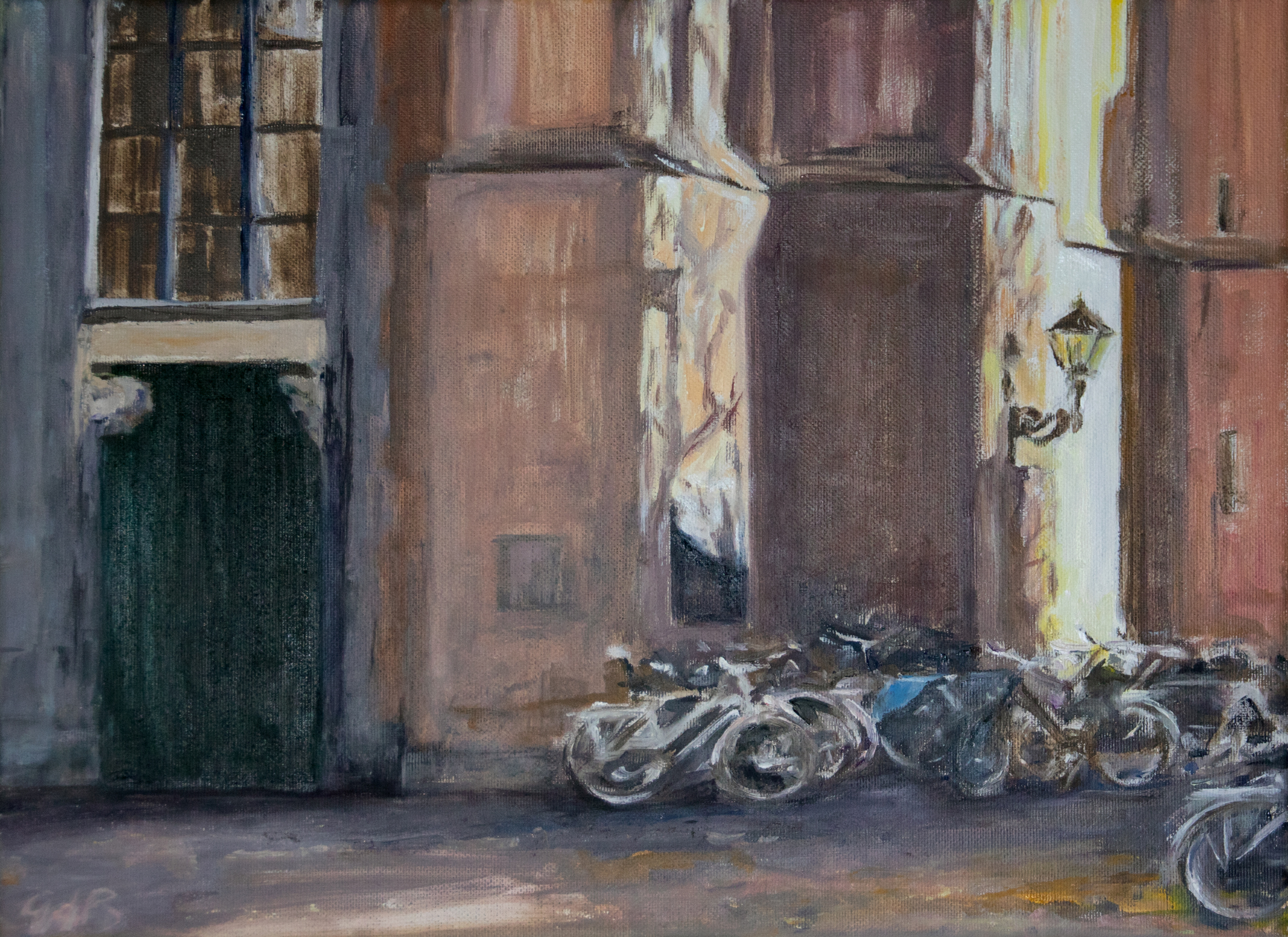 Veel contrast tussen de zon- en schaduwdelen van de kerk. De takken van de grote boom op het plein zorgen voor een lijnenspel tegen de muren. En het ging me ook om het schilderen van de fietsen, met de blauwe fietstas er tussenin. Het is op een zondagochtend in Wijk bij Duurstede.
