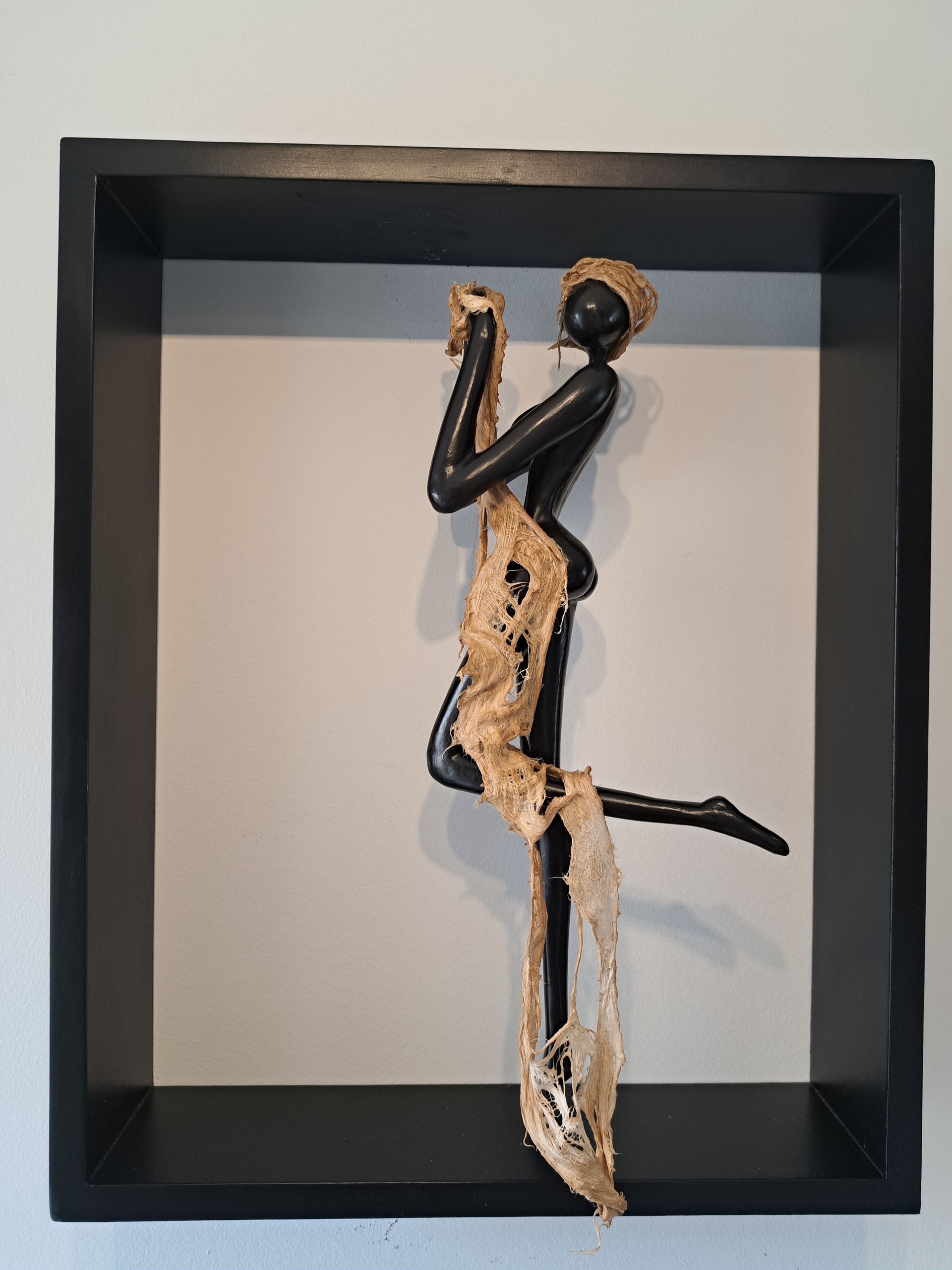 De "lady" staat in een zwarte baklijst. is verkocht maar op verzoek te maken in gewenste kleur van shawl en hoedje