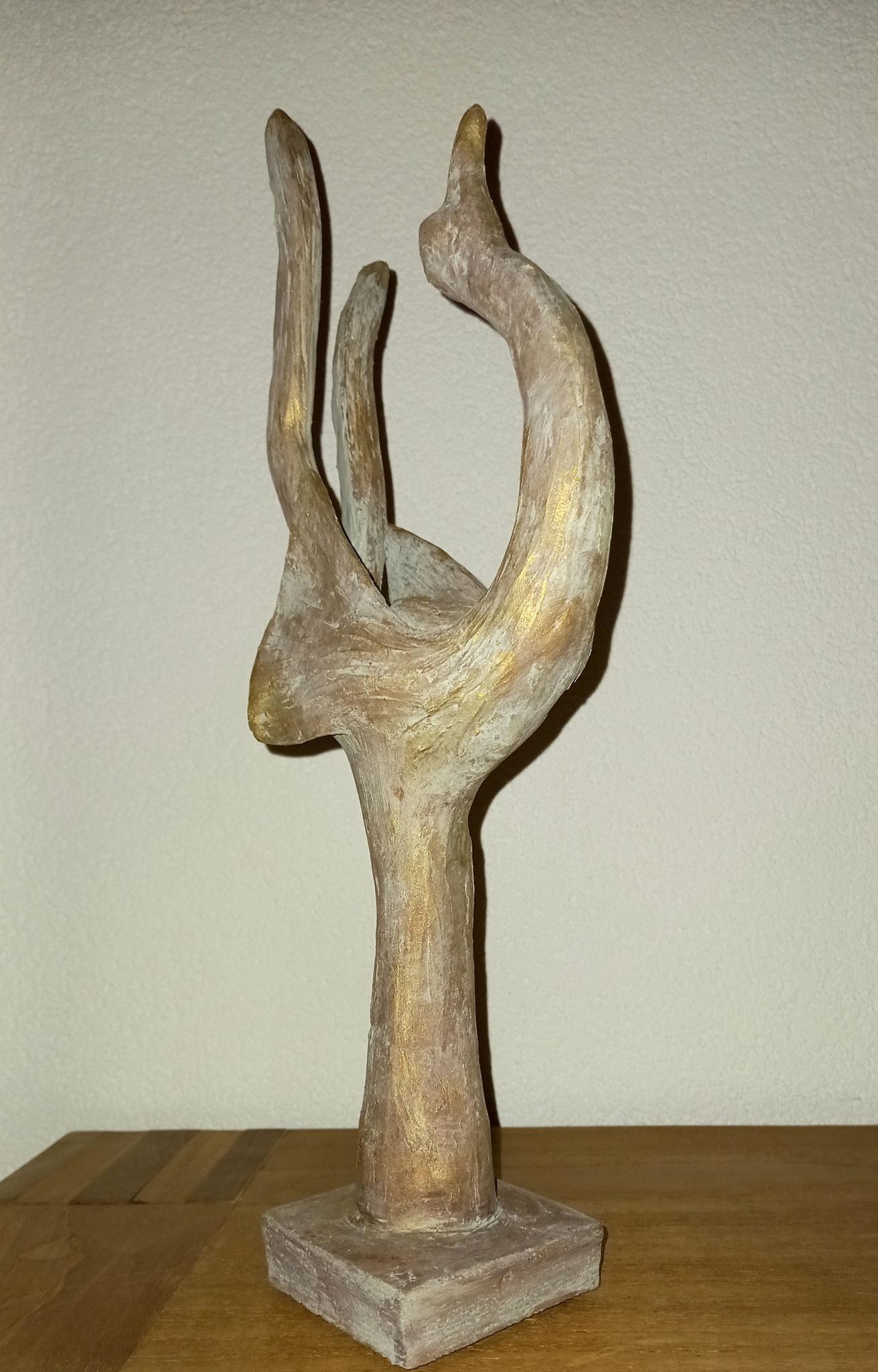 Geboetseerd vogelbeeldje, onderdeel van het project Vogel. De vorm is afgeleid van de beelden Liervogels 1 en 2. Het beeldje is afgewerkt met acrylverf in een bronsachtige kleur.