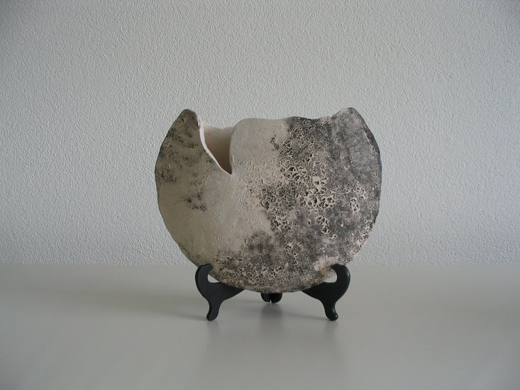 Dit is geen vaas, maar een object om naar te kijken. Met de hand opgebouwd en biquit gebakken. Daarna met onderglazuren bewerkt en opnieuw gestookt.