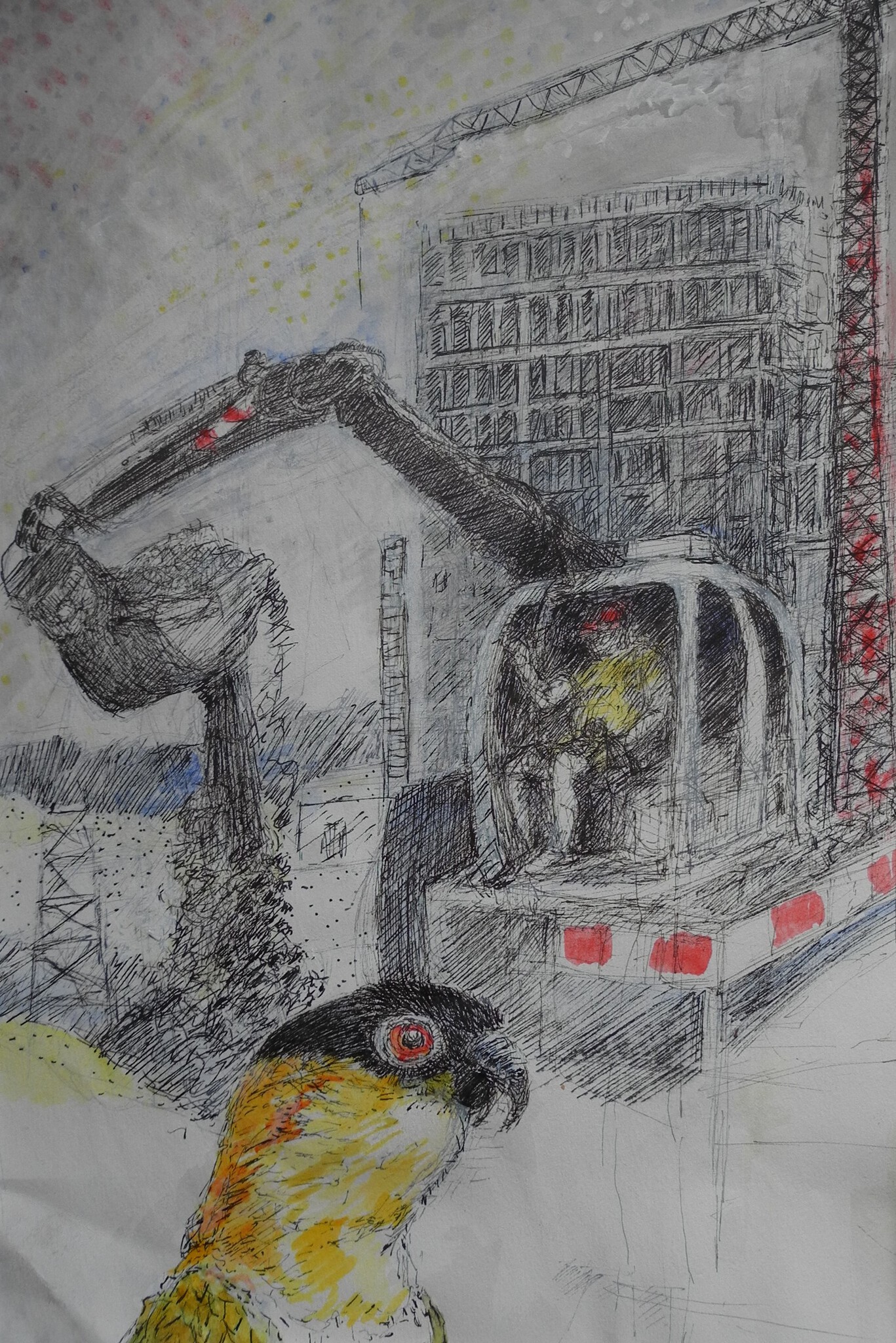 Pritty de dwergpapegaai heeft bizondere belangstelling voor de bouwactiviteiten in de Sluisbuurt