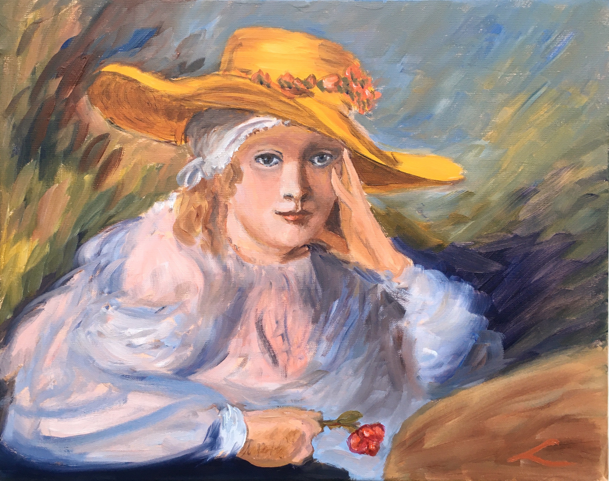 Een andere versie van het schilderij Het jonge meisje met de hoed, geïnspireerd op de tekening van Rembrandt. De afbeelding is een rustig schilderij van een meisje met haar hoofd naar links gekanteld, met een gele hoed en een wit overhemd met ruches. Ze houdt teder een rode roos vast. Haar linkerhand ligt op haar wang terwijl haar blik op de kijkers is gericht, wat een peinzende uitdrukking uitstraalt. Er wordt aangenomen dat deze serene omgeving zich in een tuin bevindt, afgerond met een harmonieuze mix van blauwe en bruine kleuren op de achtergrond.