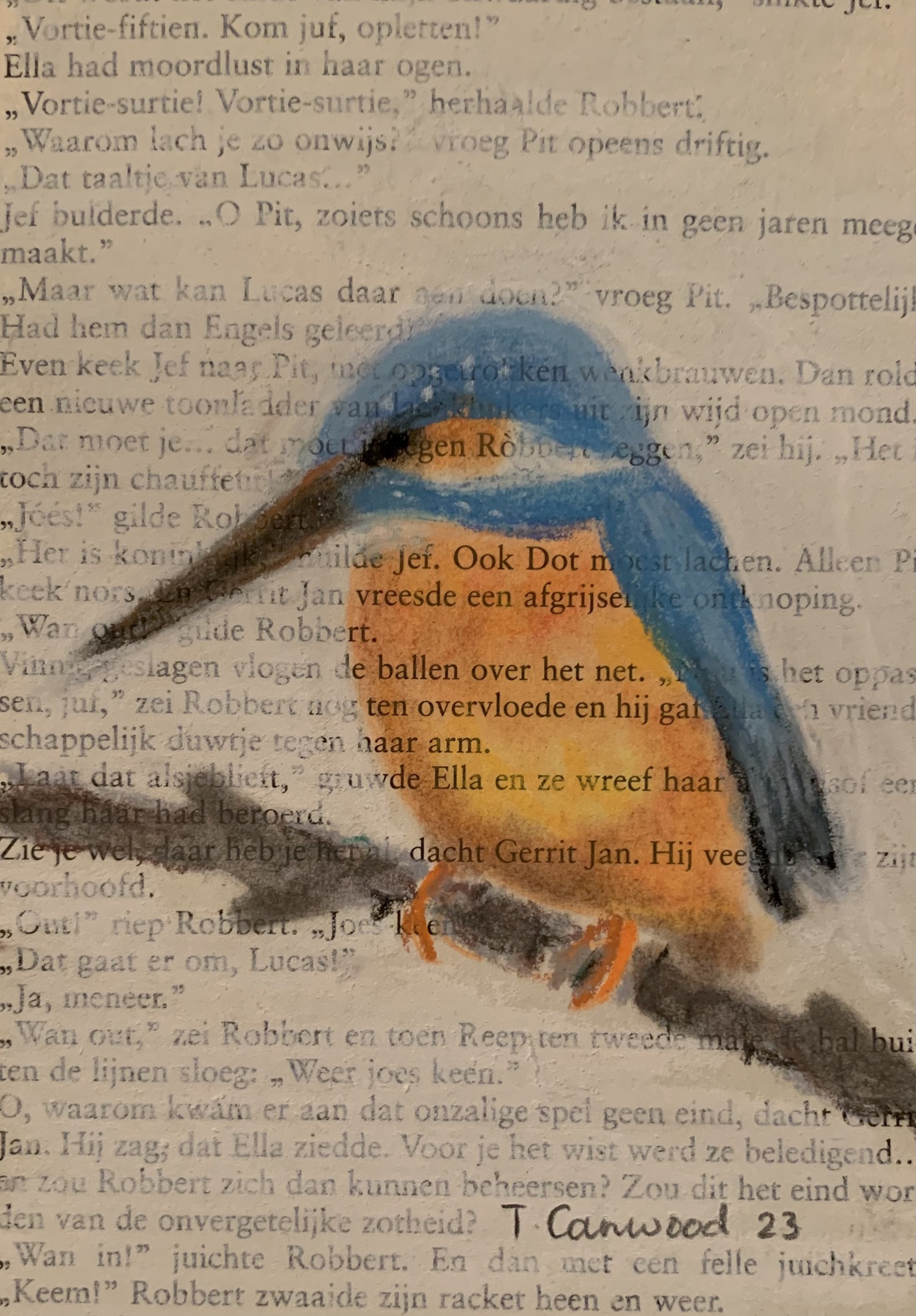 ijsvogel in krijt op een boekpagina. Ingelijst Afbeeldingsgrootte 10x15cm Formaat lijst 13x18cm