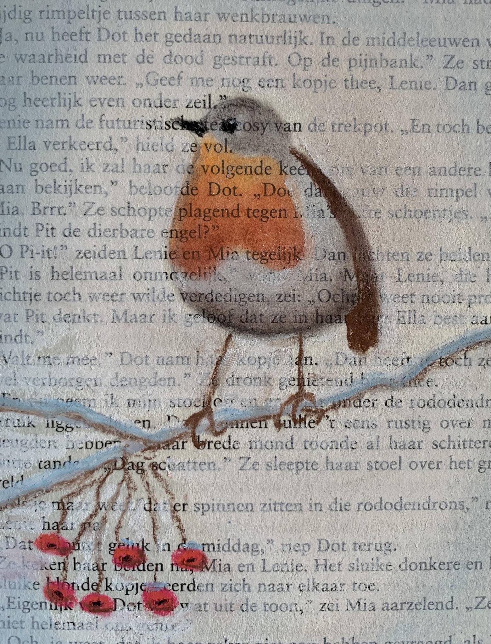 Krijttekening van een roodborstje op een pagina uit een oud boek. Ingelijst afbeeldingsgrootte 10x15cm formaat lijst 13x18cm