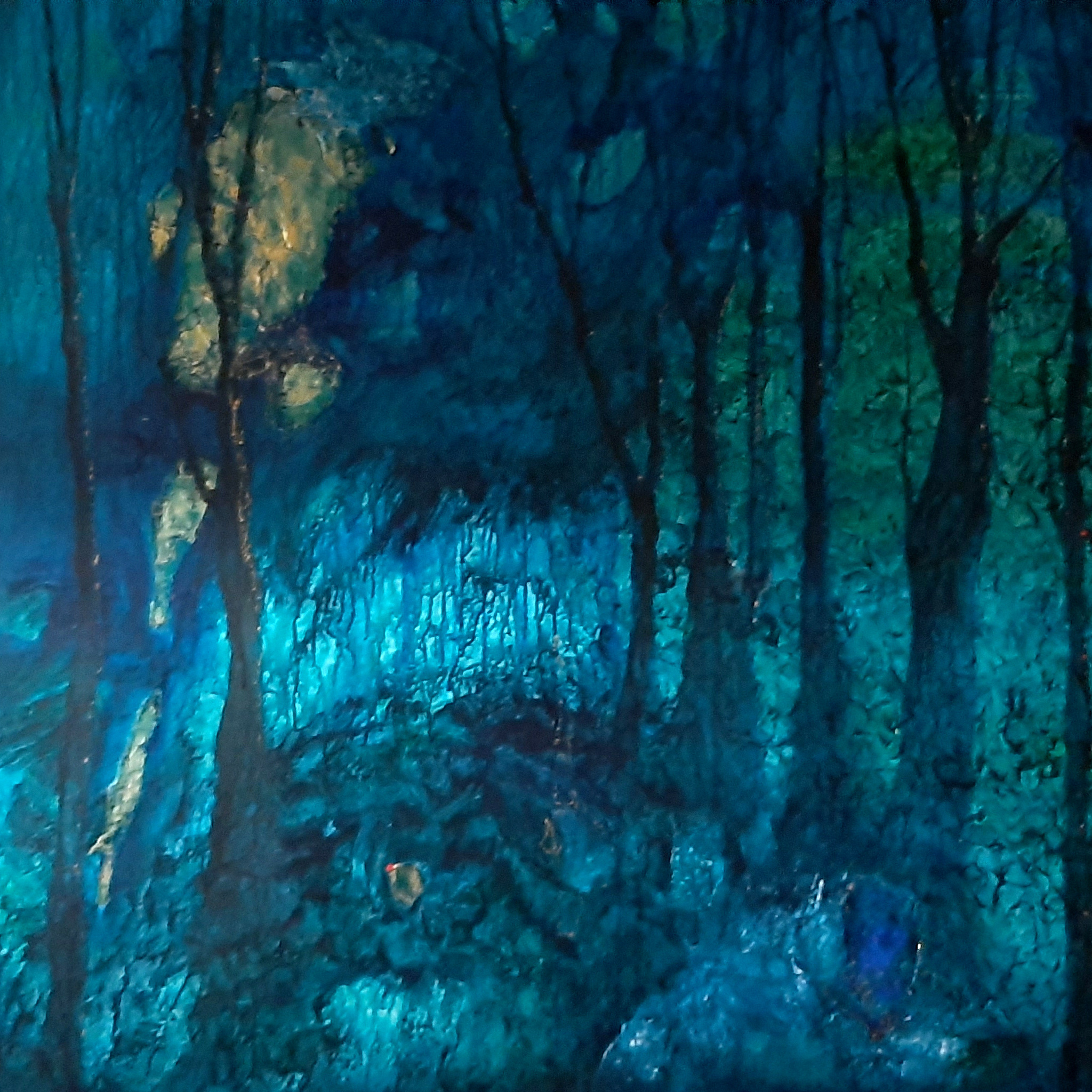De kleur blauw blijft me intigreren. Het is net alsof het me letterlijk meer ruimte geeft bij het maken van een nieuw schilderij. Zo ook in dit doek: Into the wood. Het is een beetje onheilspellend bos geworden. Er argeloos doorheen lopen word je een beetje tegengemaakt. Daarnaast biedt het bos perspectief. Aan het einde van het bos is er licht. Ten teken dat je ontsnapt bent aan de wat grillige, onderwaterachtige bomen? En daarnaast is er nog de 'gouden plak' aan de linkerzijde. Een intrigerende, maar aanlokkelijke val, waar je niet in moet trappen? Kortom: niks is zeker. Net als in het leven.