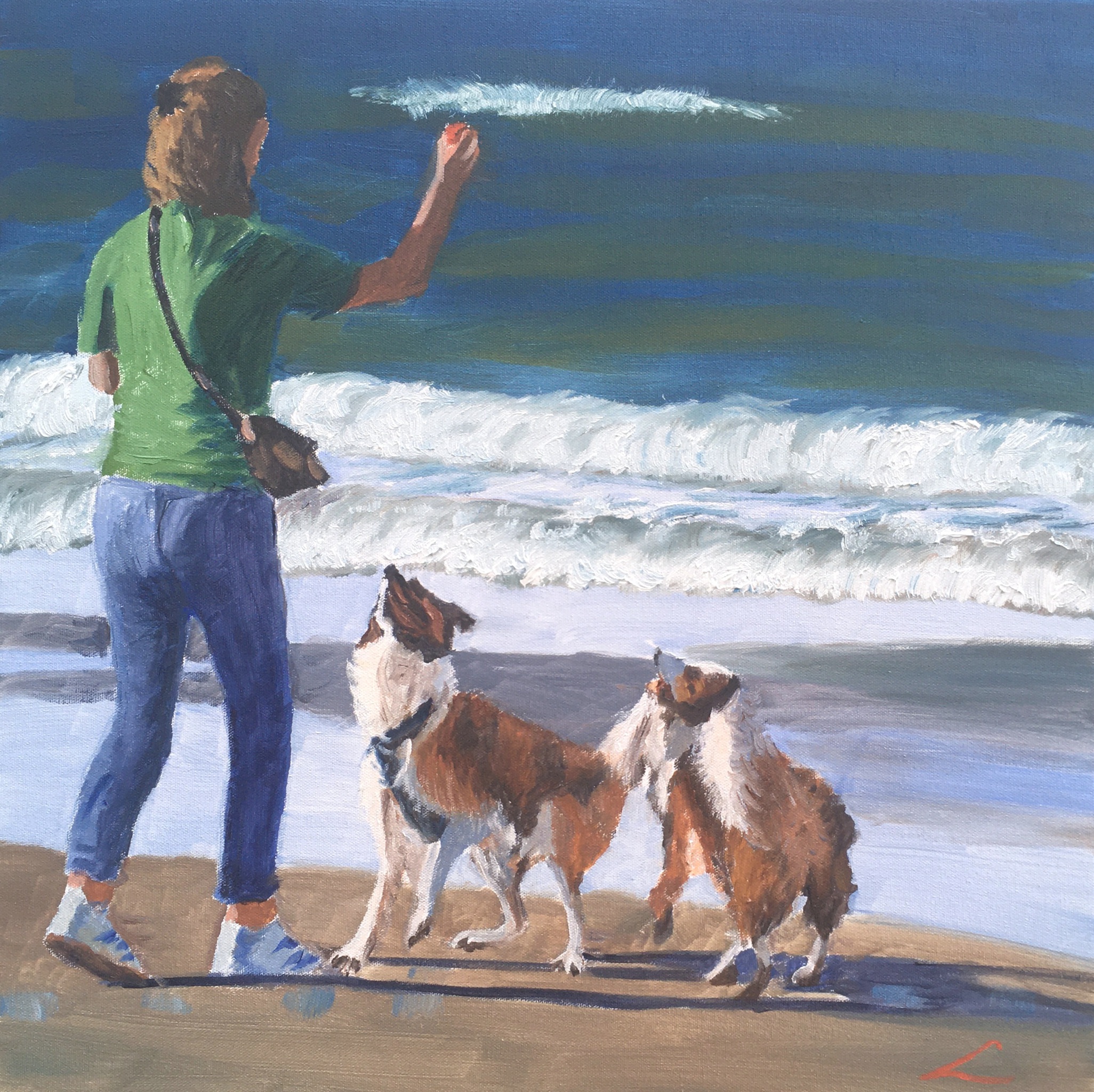 Het schilderij toont een schilderachtig strandgezicht waar een vrouw, gekleed in een groen shirt en een spijkerbroek, met haar honden bezig is. Ze bevindt zich in een dynamische houding, gooit een bal en trekt de aandacht van de honden terwijl ze bereid lijken te zijn om naar het voorwerp in de lucht te rennen. De zee, met de golven die naar binnen rollen, fungeert als een schilderachtig decor en creëert een sfeer van ontspanning en plezier.