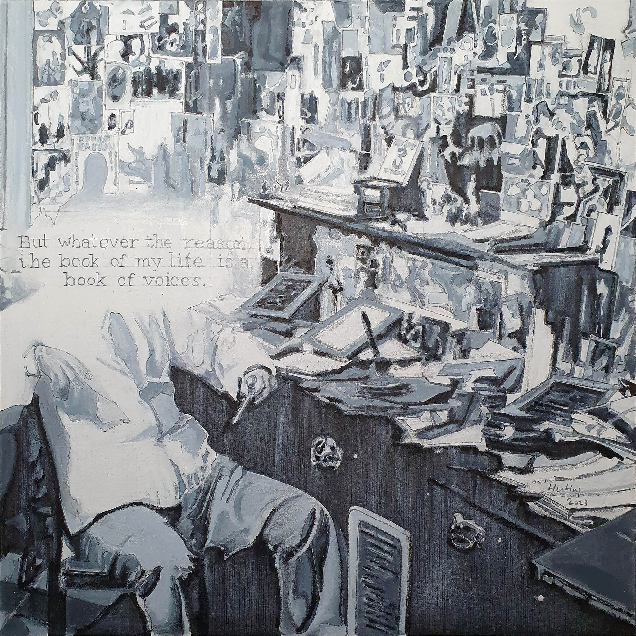 Een schrijver in zijn werkomgeving. Een kunstenaar en de omgeving waarin hij zijn werkt maakt beïnvloeden elkaar en vallen soms samen. De schrijver die hier temidden van een veelheid van foto's, knipsels, kaarten en tekeningen zit is gebaseerd op een foto van de Spaanse schrijver Ramón Gómez de la Serna. De tekst die over de witte plek die zijn hoofd verbergt geschreven is is niet van hem, maar is afkomstig uit het boek "I married a communist" van Philip Roth, die zich afspeelt ten tijde van de communistenjacht onder senator Joseph McCarthy. Ramón Gómez de la Serna was op zoek naar een nieuwe fragmentarische taal waarmee hij op een nieuwe manier naar de wereld wilde kijken.