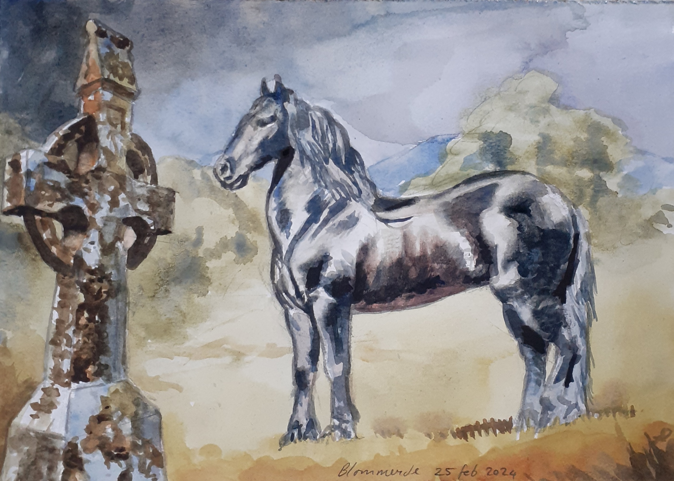 Figuratief Aquarel Realistisch Paard Kruis Verhaal Beiaard Fries Legende Ros Keltisch