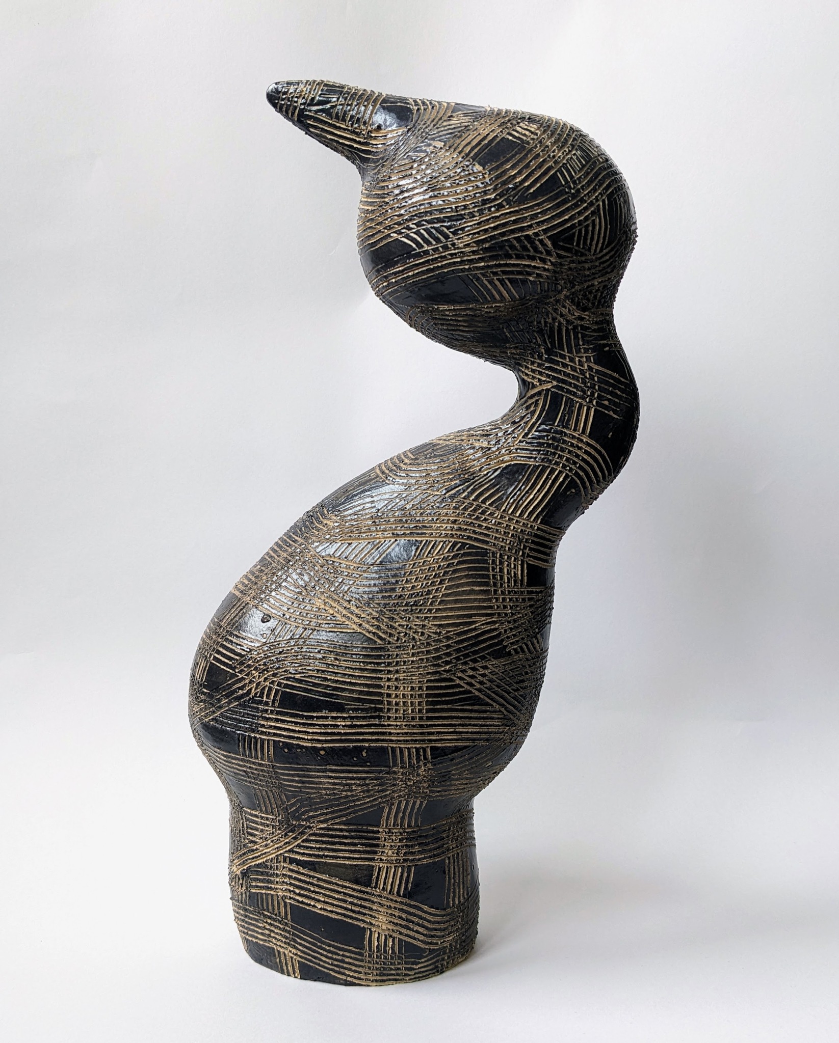 Wat wil je hier in zien? is het een dier of vogel? Bij het maken van dit object heb ik vooral de vorm gevoeld en daarna de lijnen gezet in zwarte engobe.