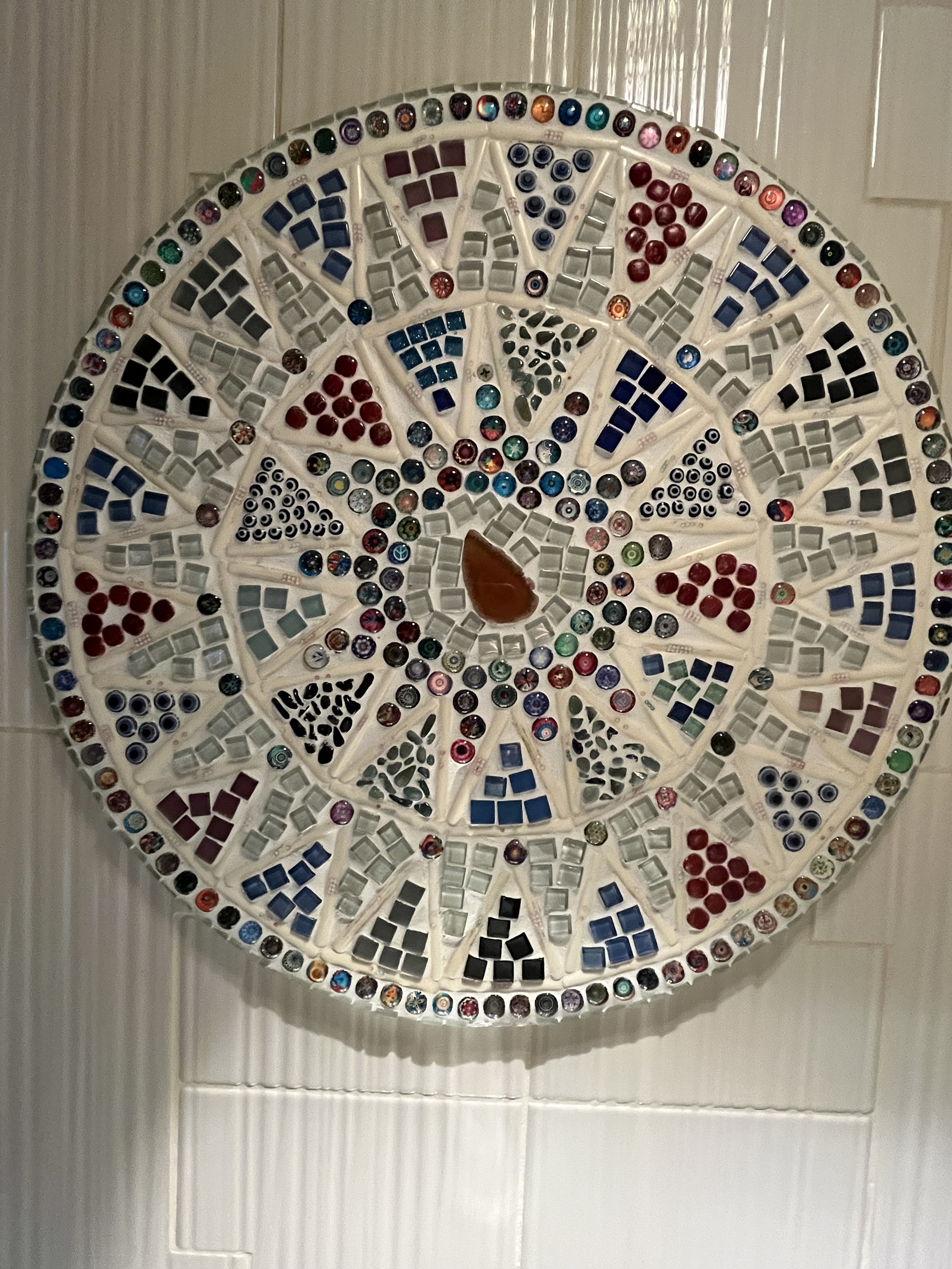Mandala bewerkt met kunststof, glas, edelstenen en keramische tegels.