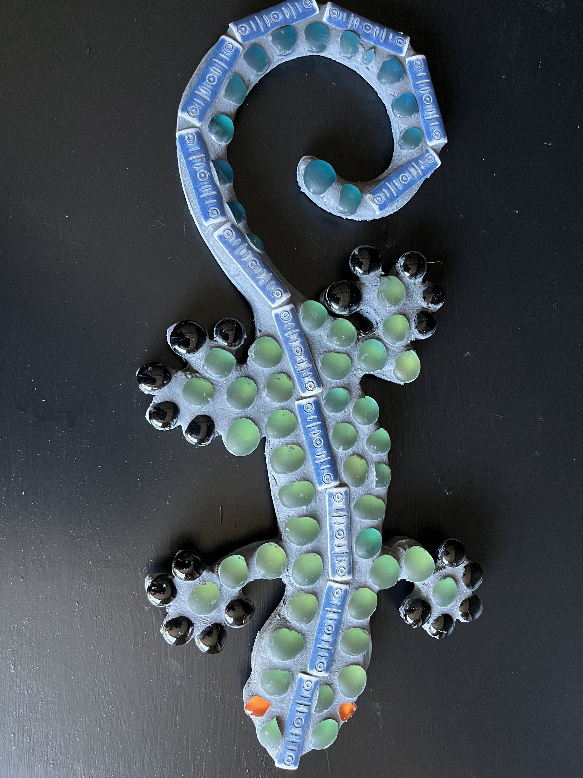 Gekko blauw en groen. Bewerkt met kralen en glas.