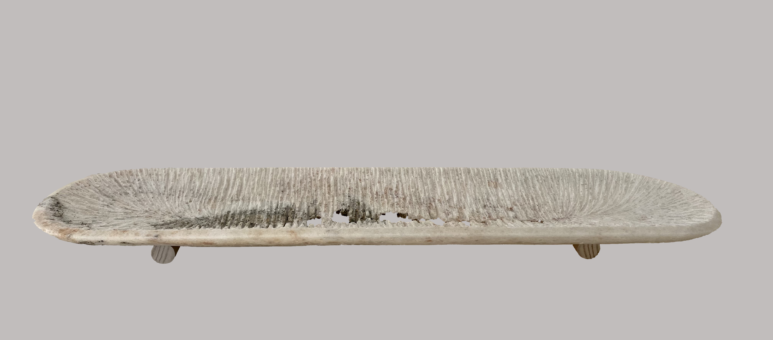 Een vrouwelijke wereld uit steen geboren. Mijn beelden dragen “het eeuwig vrouwelijke” in zich. Zij vertegenwoordigen mijn communicatie met de steen, de lijnen en structuren die zijn ontstaan door de tijden en de steen haar eigen taal geeft. Met name het samengaan van mijn innerlijke taal en die van de steen is één van de boeiende aspecten van het werken met steen: het bevrijden van een nieuwe wereld uit het eens zo vormeloze.