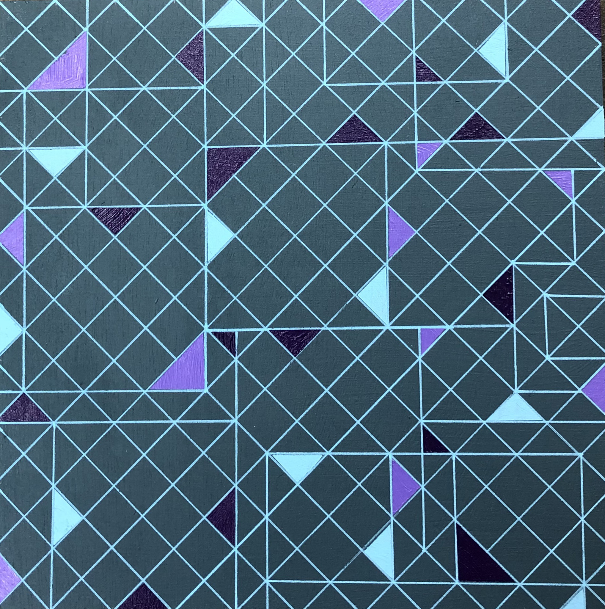Thema: Chaos (Geometrische Chaos) Mijn kunst is beïnvloedt door de moderne wiskundige en wetenschappelijke benadering van het begrip complexe orde van de natuur. Met name heb ik me verdiept in de Chaos theorie en de fractal geometrie. Ik ben geen wiskundige, en ik gebruik geen wiskundige formules. De ideeën van de Chaos theorie en fractal geometrie leiden tot de ontwikkeling van de composities in mijn werk. Ik gebruik driehoeken,vierkanten en cirkels in mijn schilderijen, maar in mijn huidige serie, geoChao richt ik me alleen op de vierkanten en de verhoudingen tussen de vierkanten. Ik ontwikkel mijn composities door kleine vierkantjes op grote te zetten of grote op kleine te zetten. Het gaat om de onderlinge verhoudingen tussen de vierkanten. Ik laat de methode die ik kies de compositi