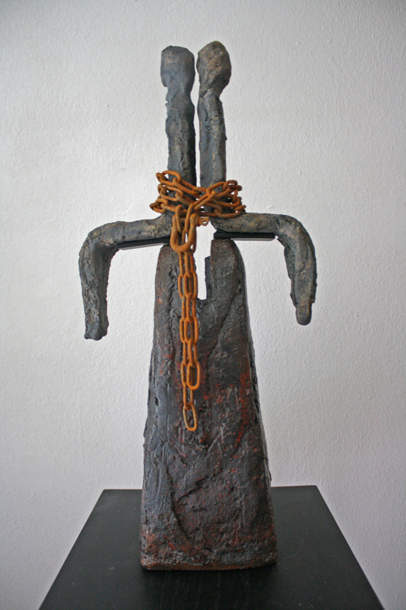 Klei, grof, gevormd, geduwd, geschraapt. Ruwe huid, schrale kleur en soms gecombineerd met metaal. Hiermee kan ik mijn ideeën en gedachten verbeelden. Mijn beeld vertelt, de kijker luistert.