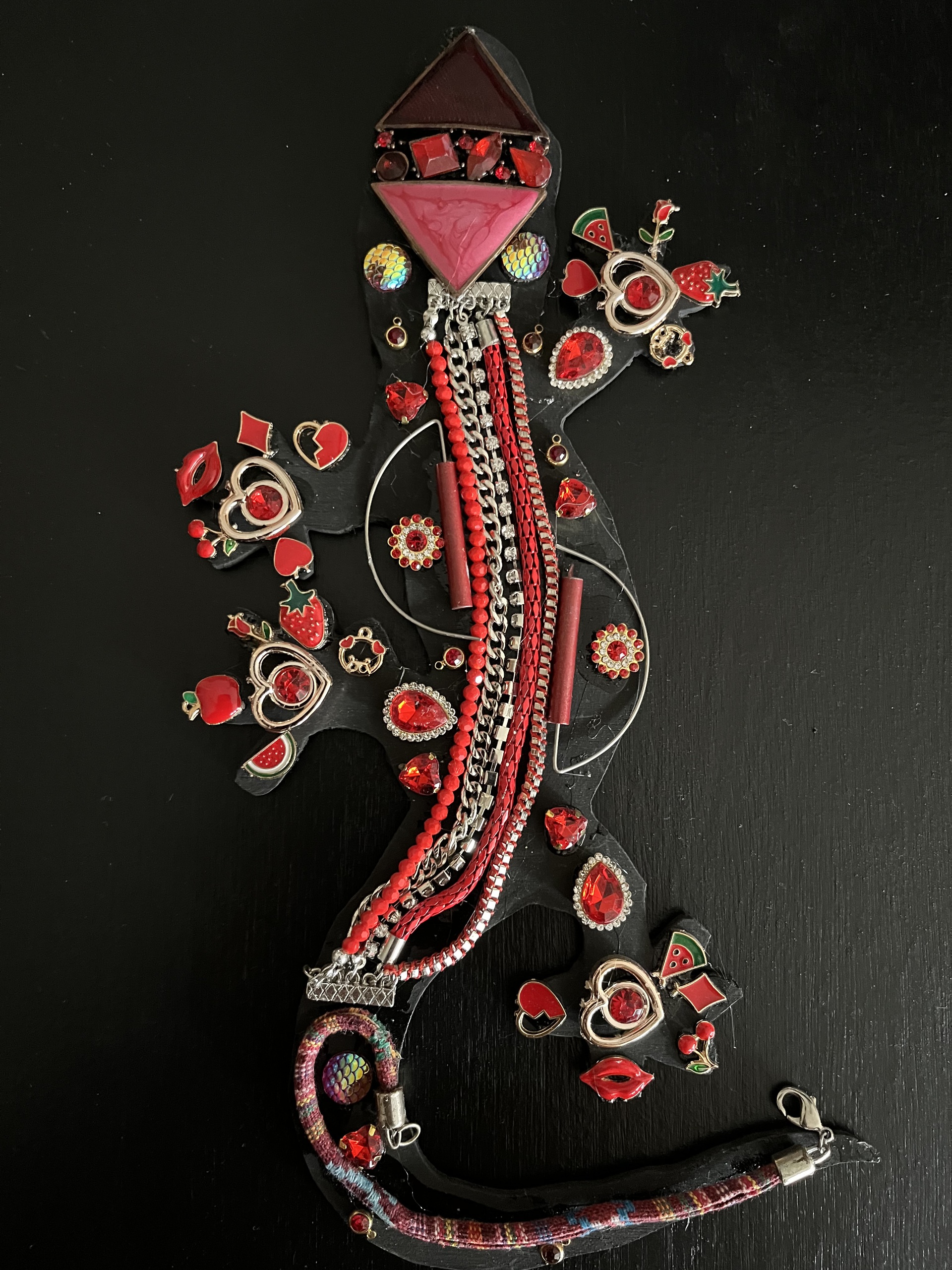 Gekko op zwart houten ondergrond. Bewerkt met rode sieraden.