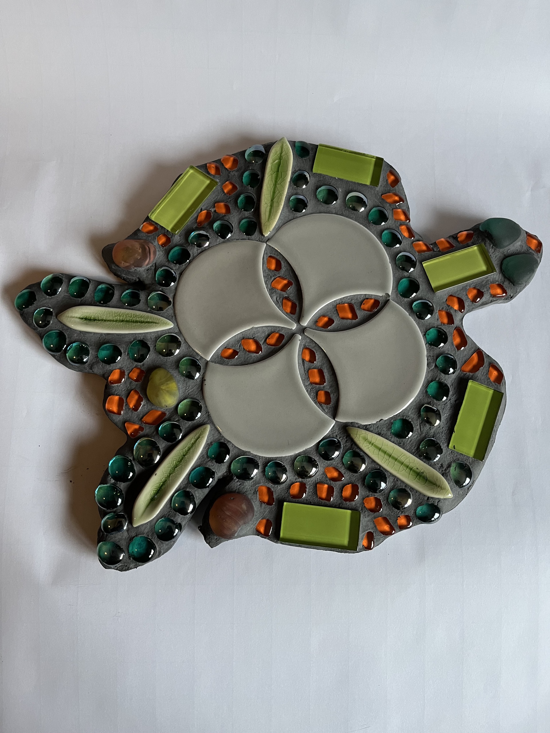 Schildpad op houten ondergrond. Bewerkt mat glas en keramische tegels.