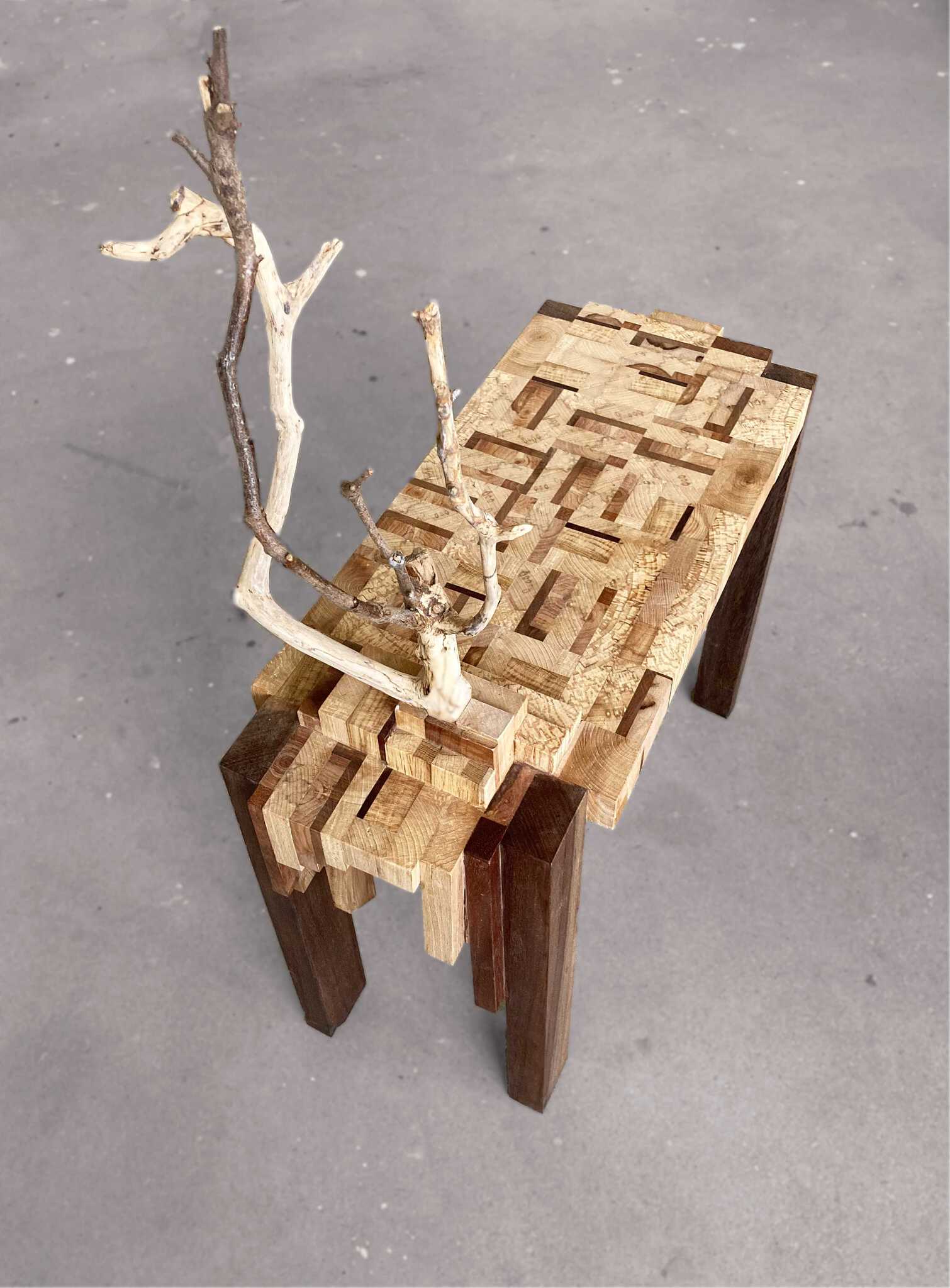 Een langwerpige tafel met donkere poten. Aan de ene kant ziet men een verhoging waar een tak uit groeit. Het blad heeft een fascinerende houttekening. Afmetingen: L66 x B27 x H50(blad) H101 (totaal) Houtsoorten: azobé | beuken| meranti | merbau | esdoorn | eiken | noten Afgewerkt met white wash en hard-wax olie Nb. Bij verkoop kan de tafel alleen afgehaald worden of eventueel gebracht. De kosten zijn voor de koper