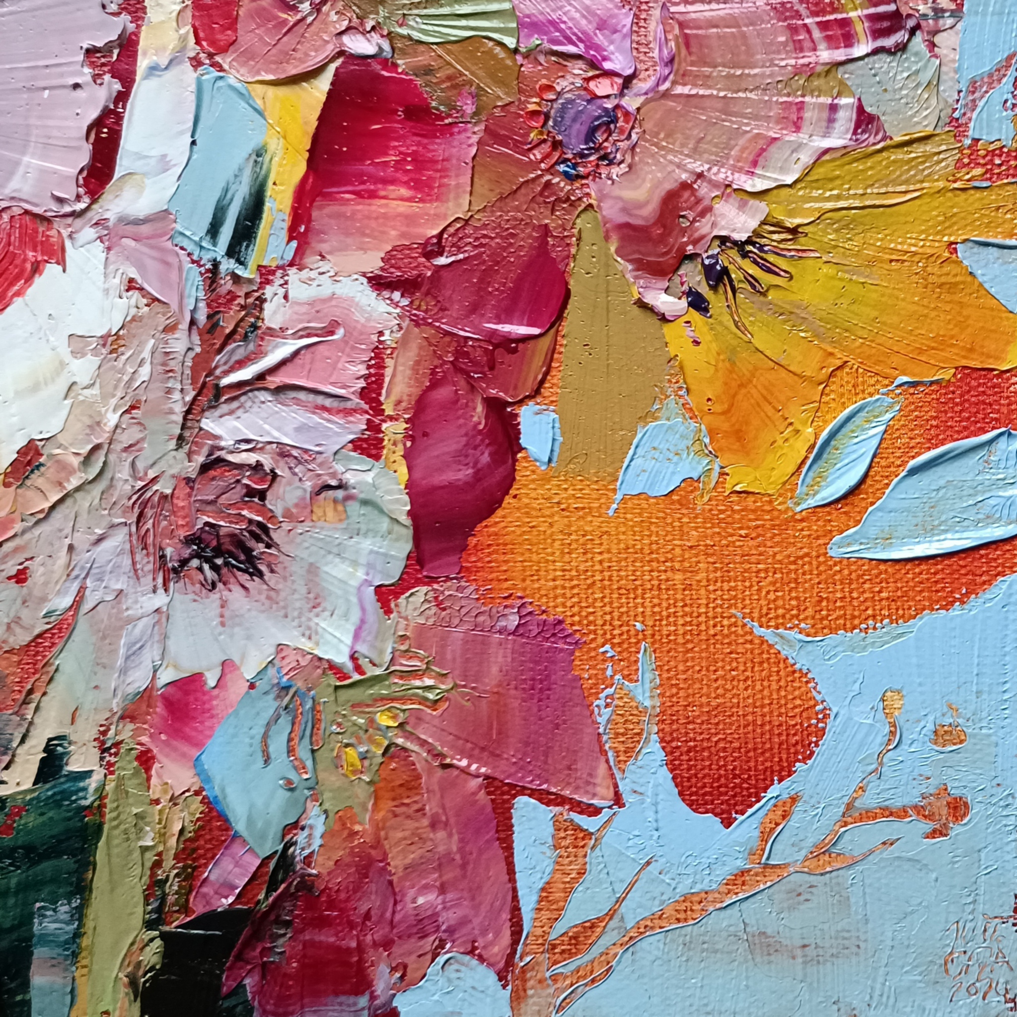 Schilderij Abstract Bloemen Klein Hout Art Kleurrijk Olieverf Kunst Painting New Galerie Stilleven Flower Still Life Flowers Paletmes Impression Miniatuur Panel Floral Knife Bold Impasto