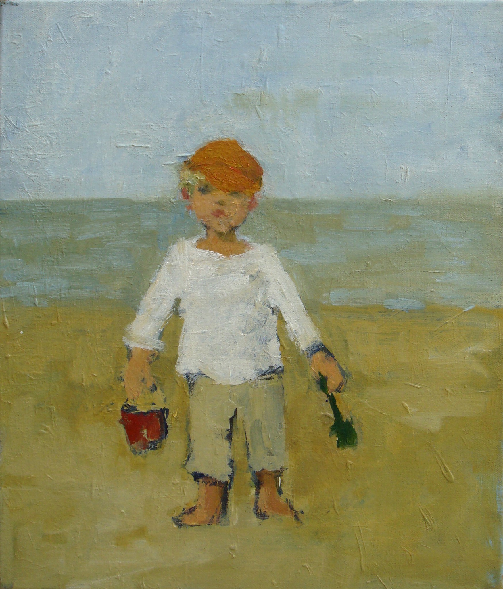 Niet te koop. De peuter op het strand. is mijn kleinkind. Veel mensen herkennen hun eigen kind of kleinkind in dit schilderijtje.