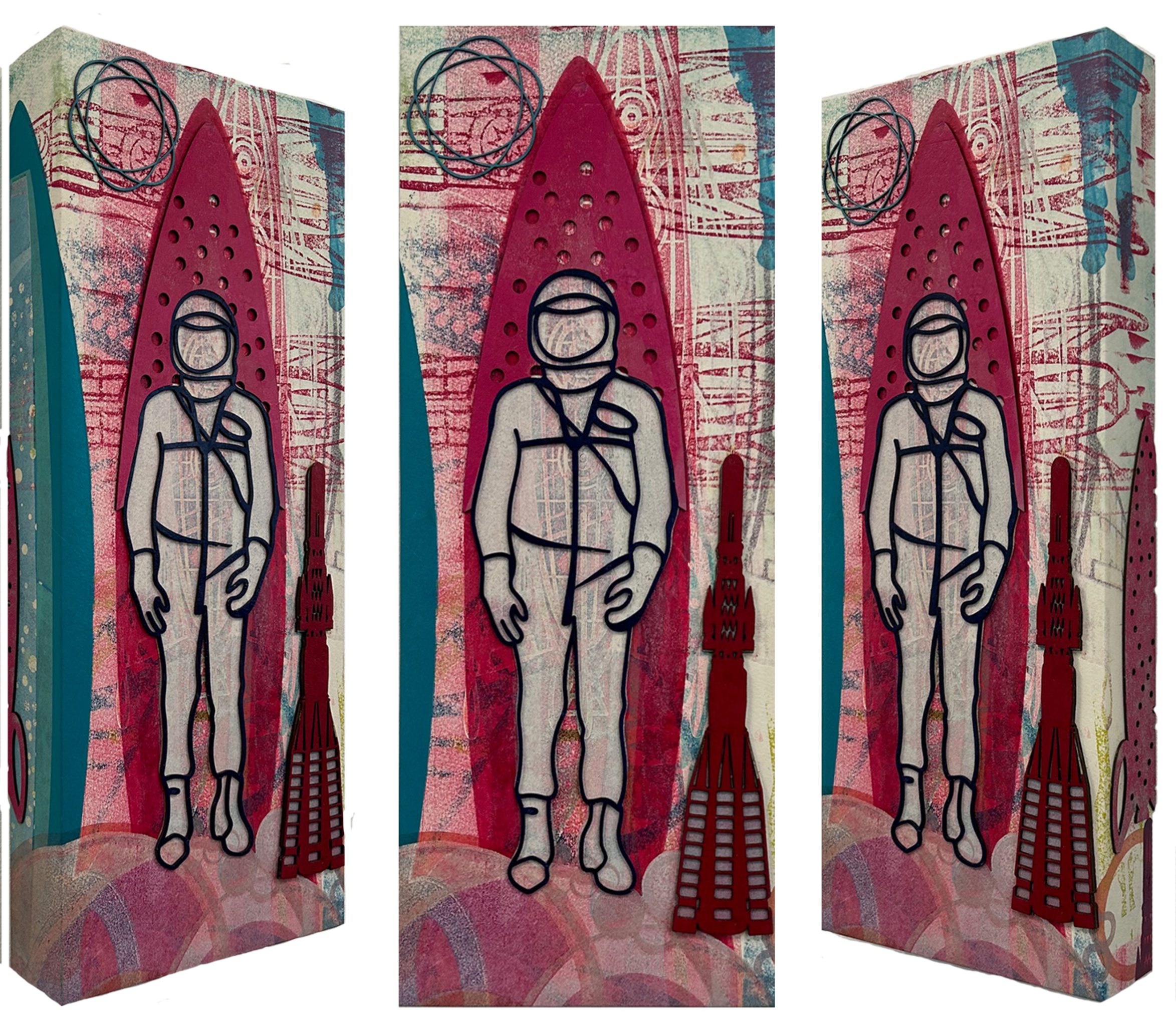 Grafiek Collage Reizen Raket Astronaut Zon Rood Oranje Blauw Papier Kleurrijk Op Kunst Werk Roze Origineel Kunstwerk Heelal Sterren Sterrenbeeld Planeten Melkweg Universum Wetenschap Reiziger