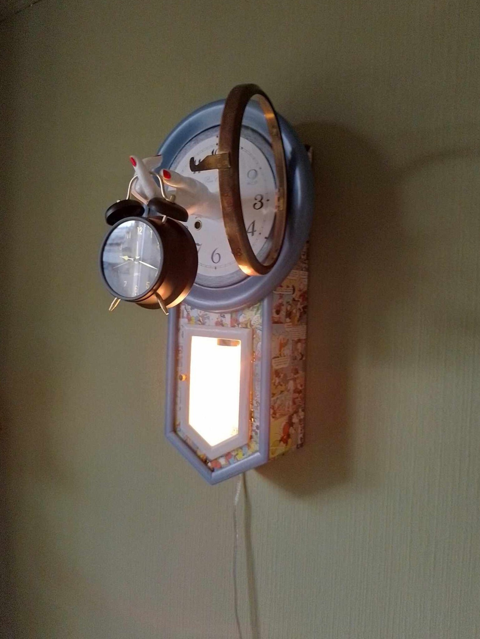 Lamp-klok bewerkt met donaldduck decoupage, beschilderd met acrylaat verf, en hand van een etalagepop.