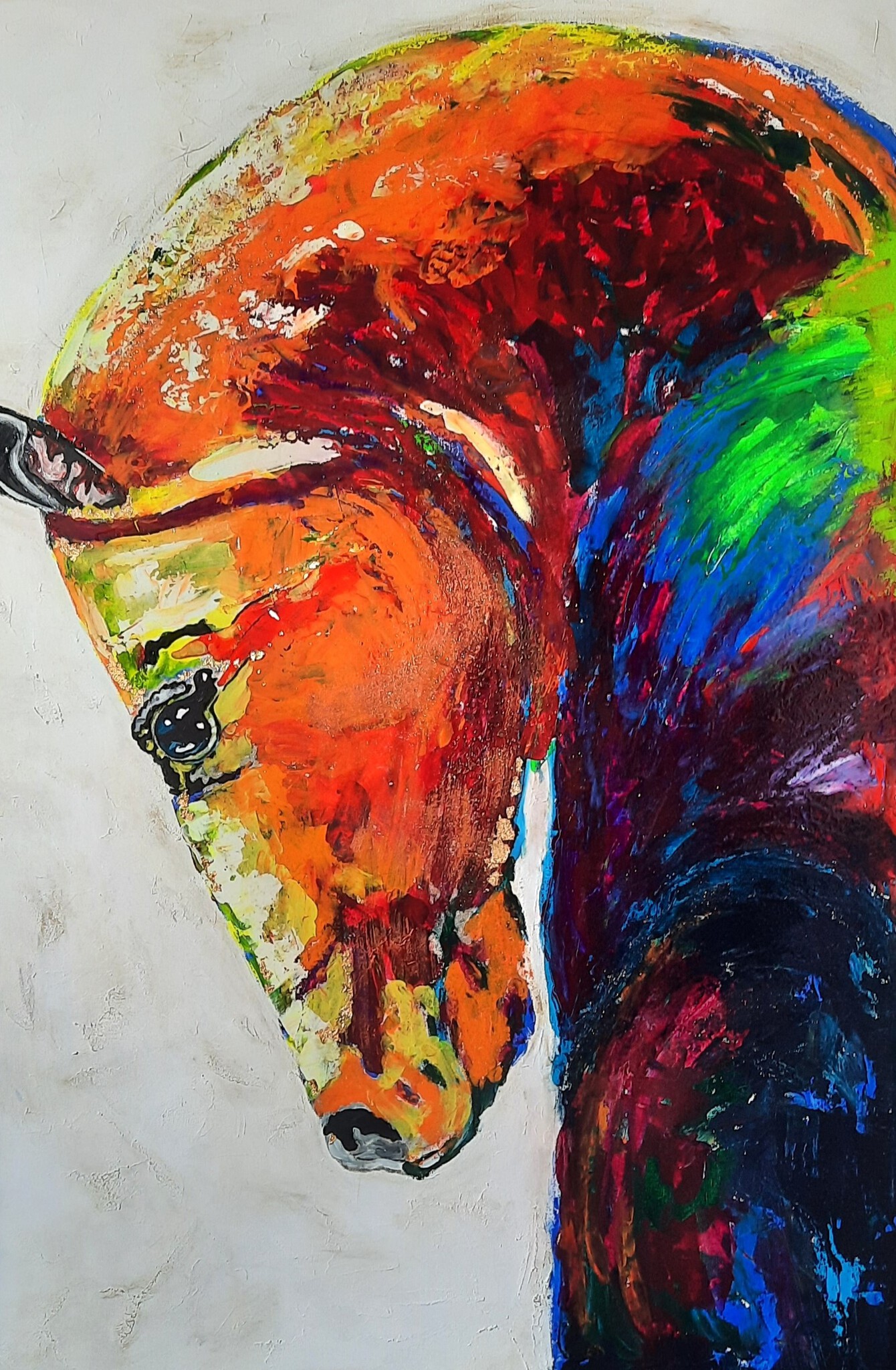 Enorm groot paard in prachtige kleuren gemaakt. De afwerking is met een laagje natuurvriendelijke giethars waardoor de afbeelding en kleuren extra 3D effect krijgen.