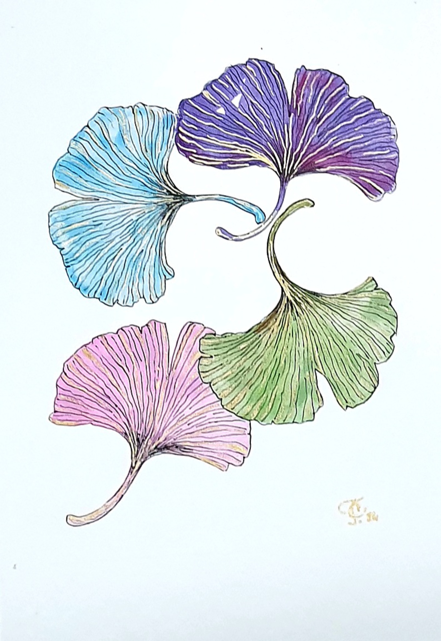 Inspiratie van onze Ginkgo biloba in de tuin. De kleurrijke bladeren in het najaar geven veel positieve energie dat ik deze bladeren na het tekenen met inkt nog een kleur heb gegeven met aquarelverf. Deze boom geeft energie door zijn helende kracht en prachtige kleuren in het najaar.