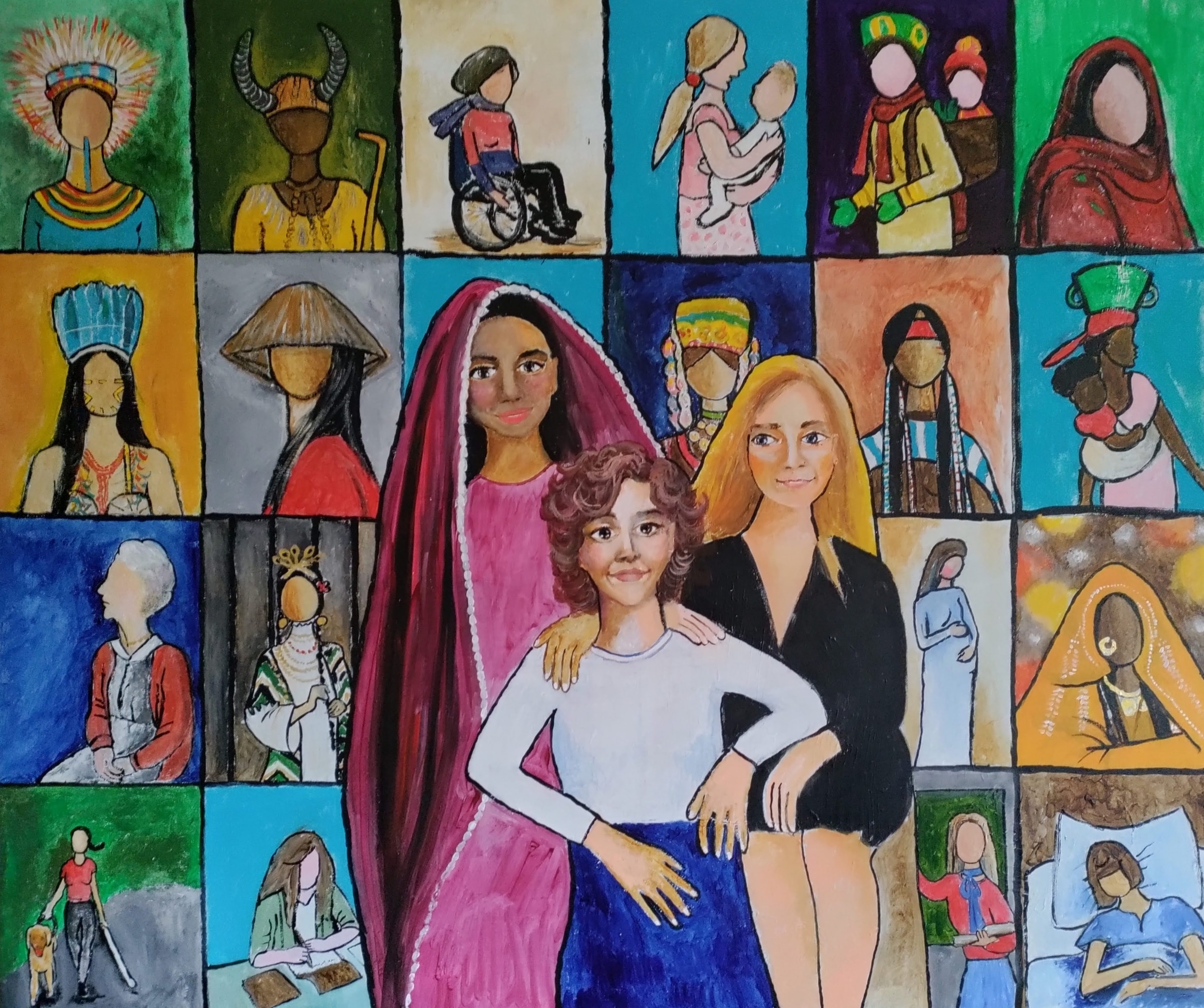 Voor #InternationaleVrouwendag schilderde Esther Veerman in 2024 het schilderij "Verbinding door Verhalen". Vrouwen komen vaak uit diverse culturen samen en kunnen zoveel met elkaar delen. Door te vertellen over je eigen achtergrond, je situatie of context kunnen andere vrouwen zoveel van jou leren. Door te luisteren naar een verhaal van iemand die iets mee heeft gemaakt wordt wederom jouw leven verrijkt. De vrouwen op de voorgrond van het schilderij brengen dat in beeld. Zij maken echt contact met elkaar en kijken ons ook aan en nodigen ons uit tot het maken van echt verdiepend contact met elkaar. Ook jij bent uitgenodigd.
