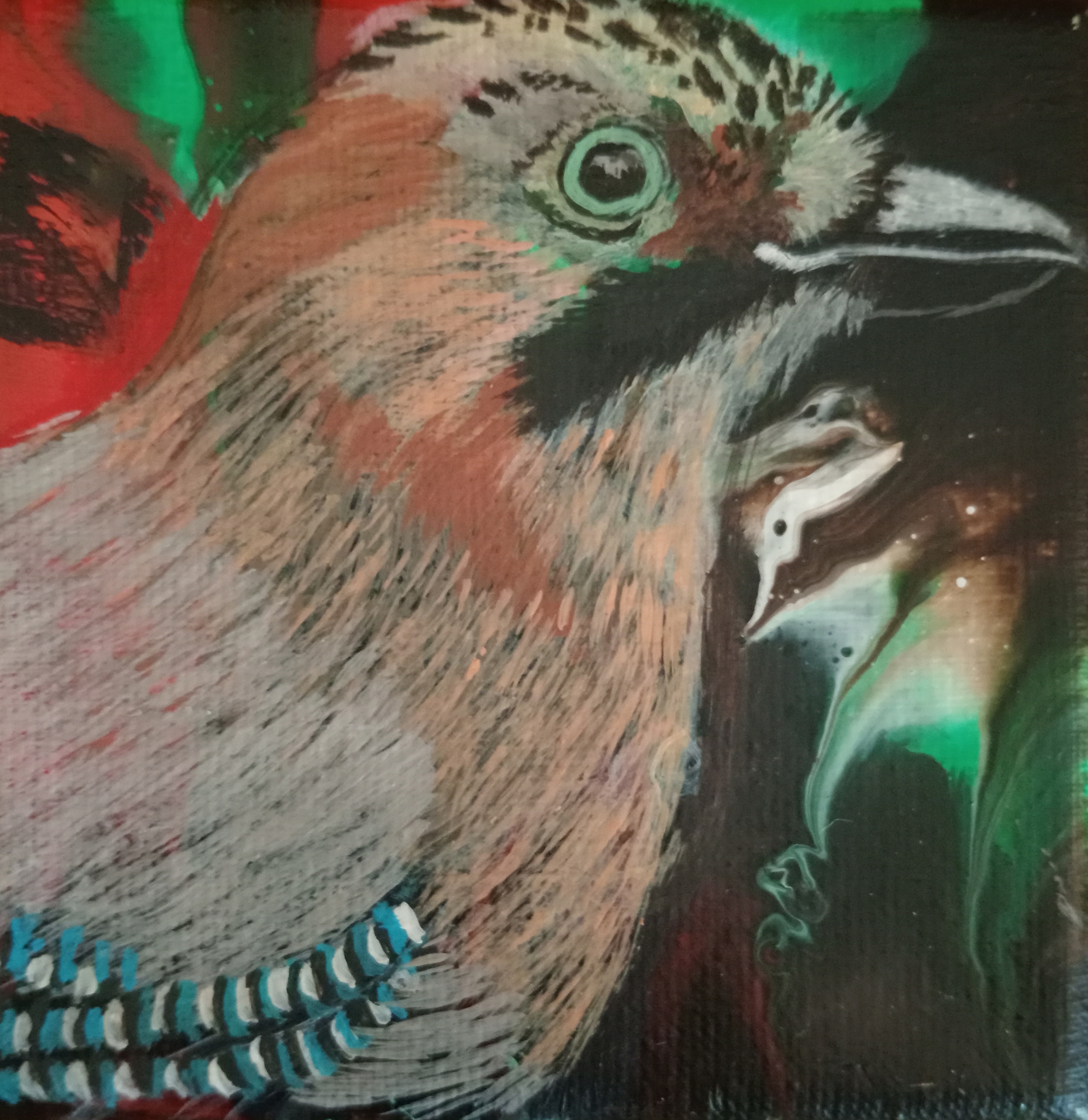 Deze gaai (voorheen Vlaamse gaai) Is geschilderd op een miniatuur die is voorbewerkt in speciale giettechnieken. Je kunt het ophangen en neerzetten. Ik noem ze graag dierenblokjes.