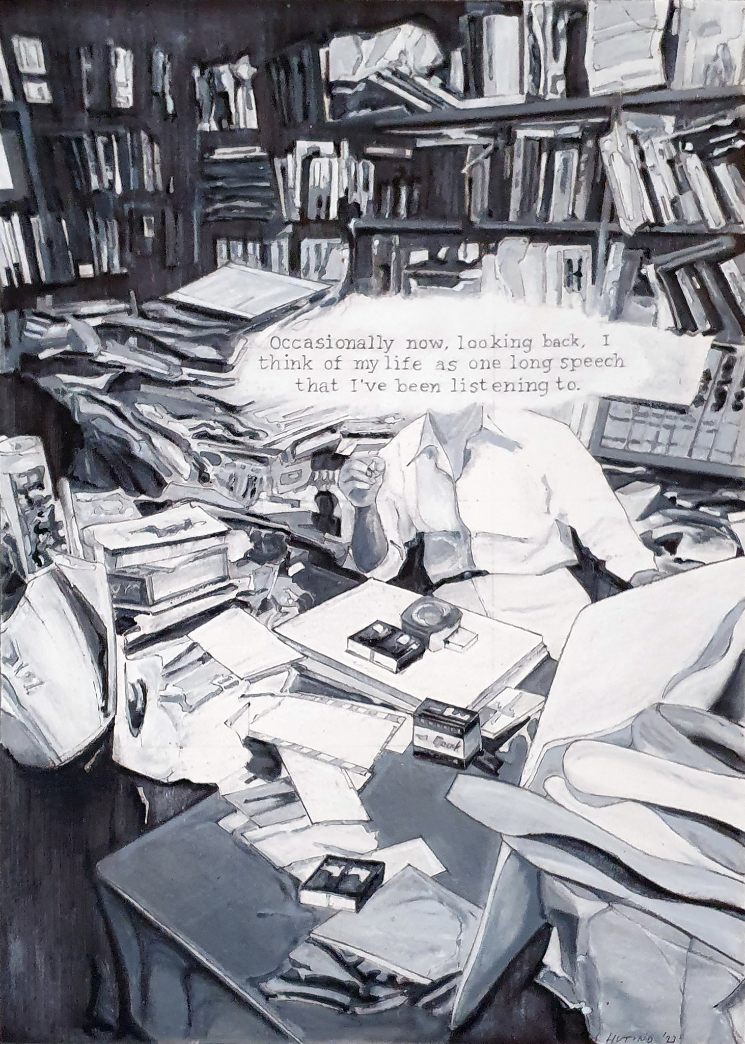 Een schrijver in zijn werkomgeving. Een kunstenaar en de omgeving waarin hij zijn werkt maakt beïnvloeden elkaar en vallen soms samen, hij werkt altijd door op het werk van anderen waarmee hij zich omringt. De text "Occasionally now, looking back, I think of my life as one long speech that I've been listening to" komt uit het boek "I married a communist" van de Amerikaanse schrijver Philip Roth.