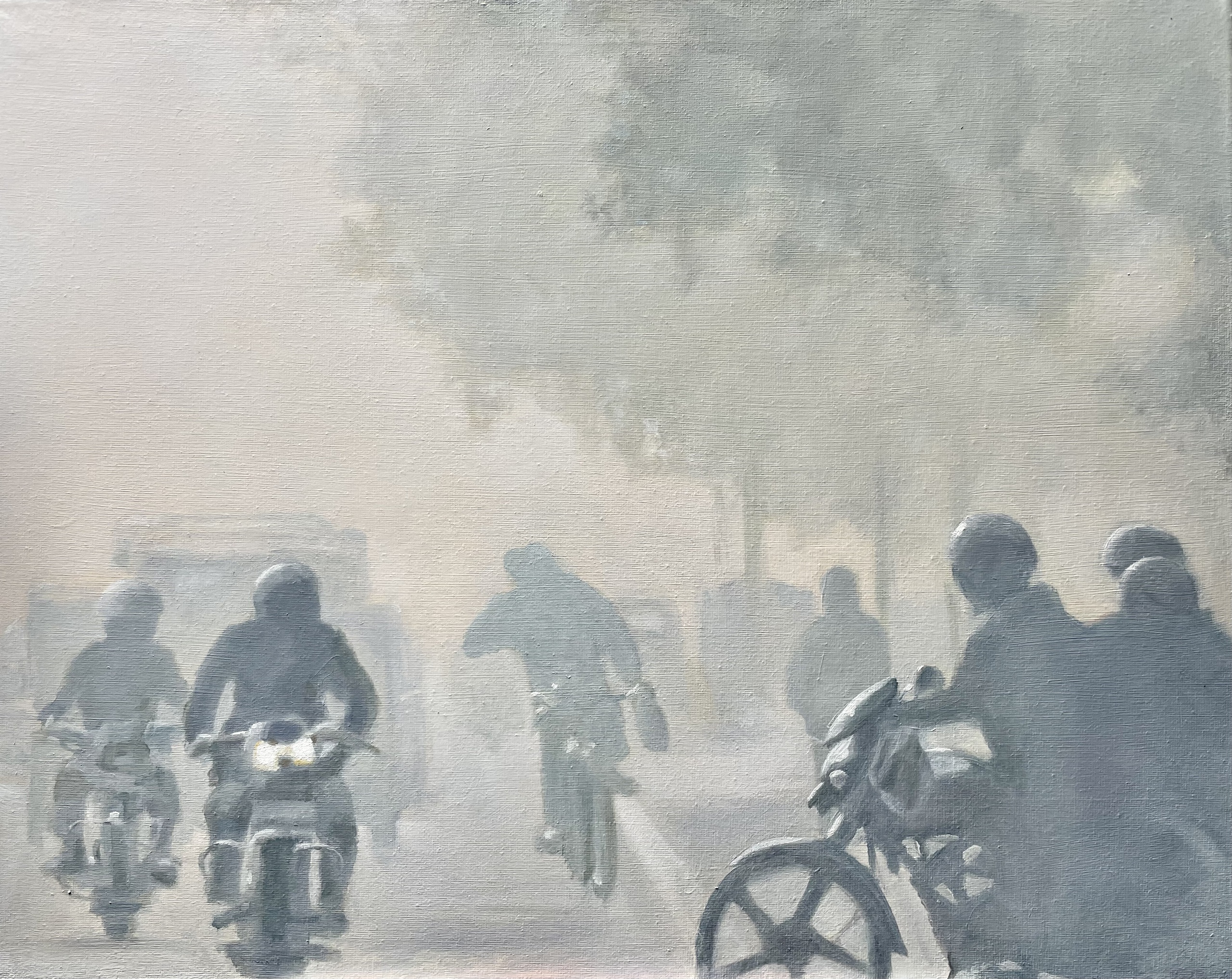 De fietser schoont zijn neus temidden van de fijnstofuitstoters.