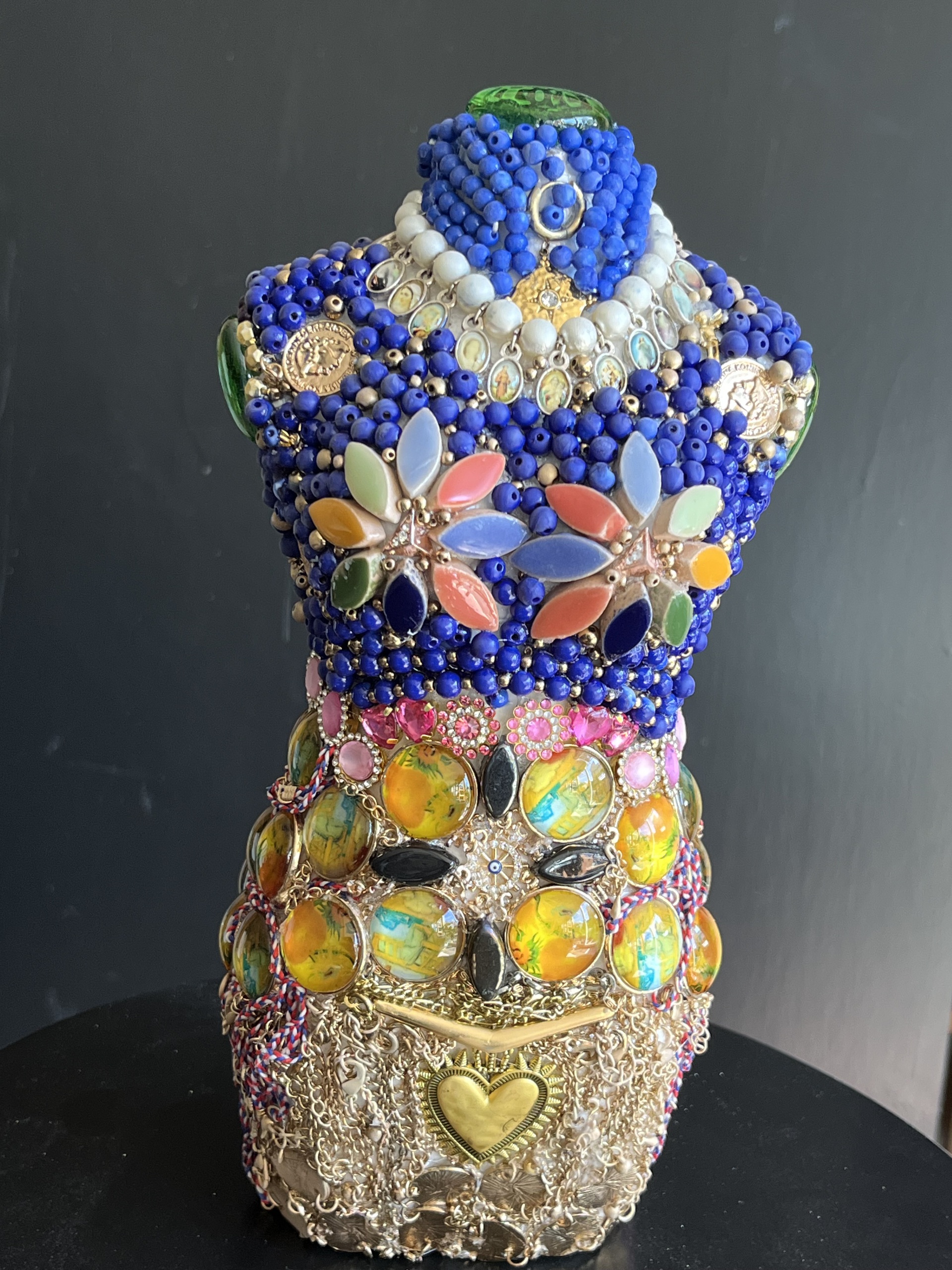 Torso vrouw bewerkt met keramische tegels, glas en sieraden in blauw, geel en goud.