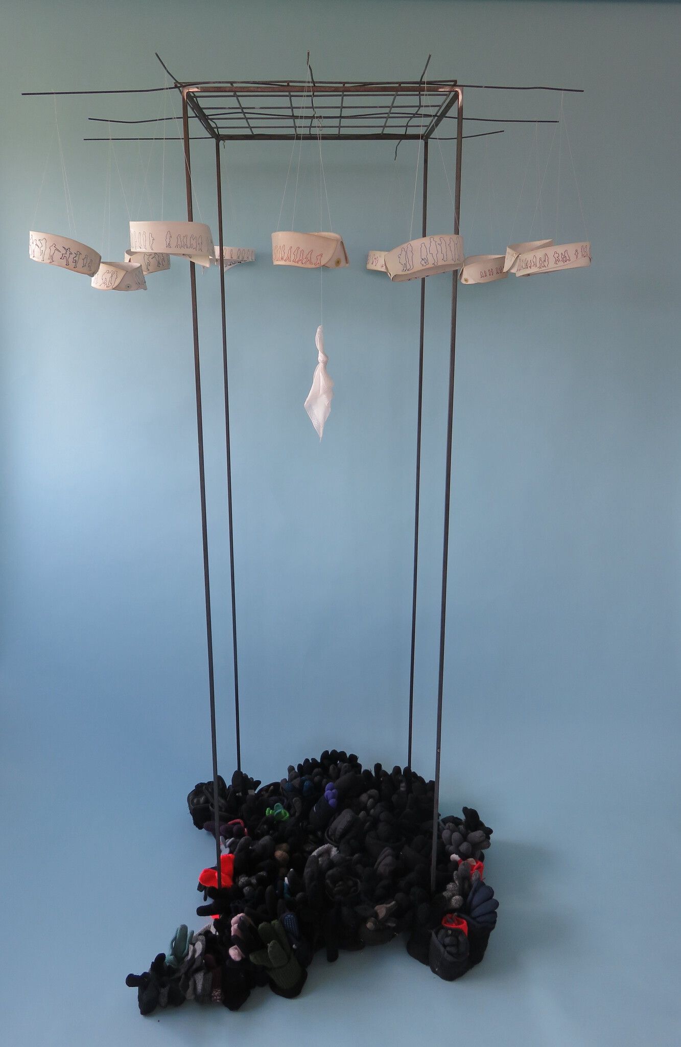 Installatie van gevonden handschoenen, zakdoekje, geborduurde boorden op ijzeren rek