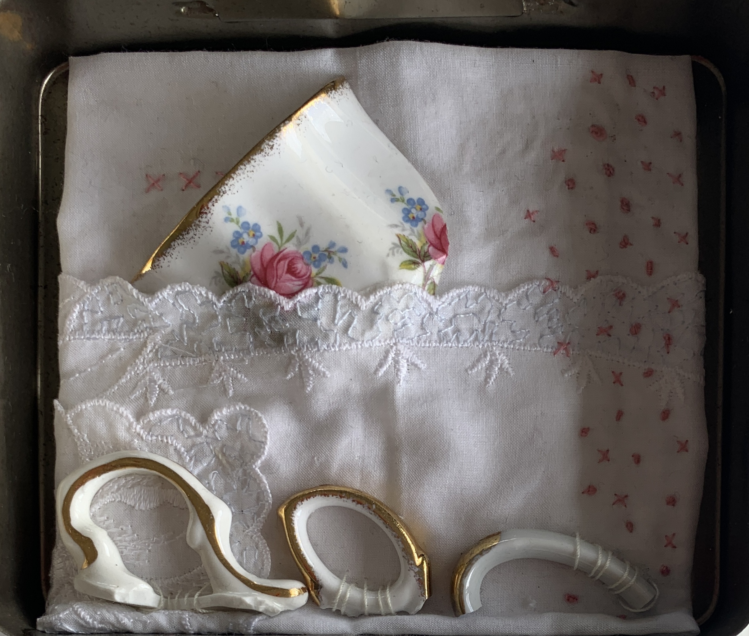 werk in oud sigarenblikje van vintage zakdoekje, theekopjes, garen