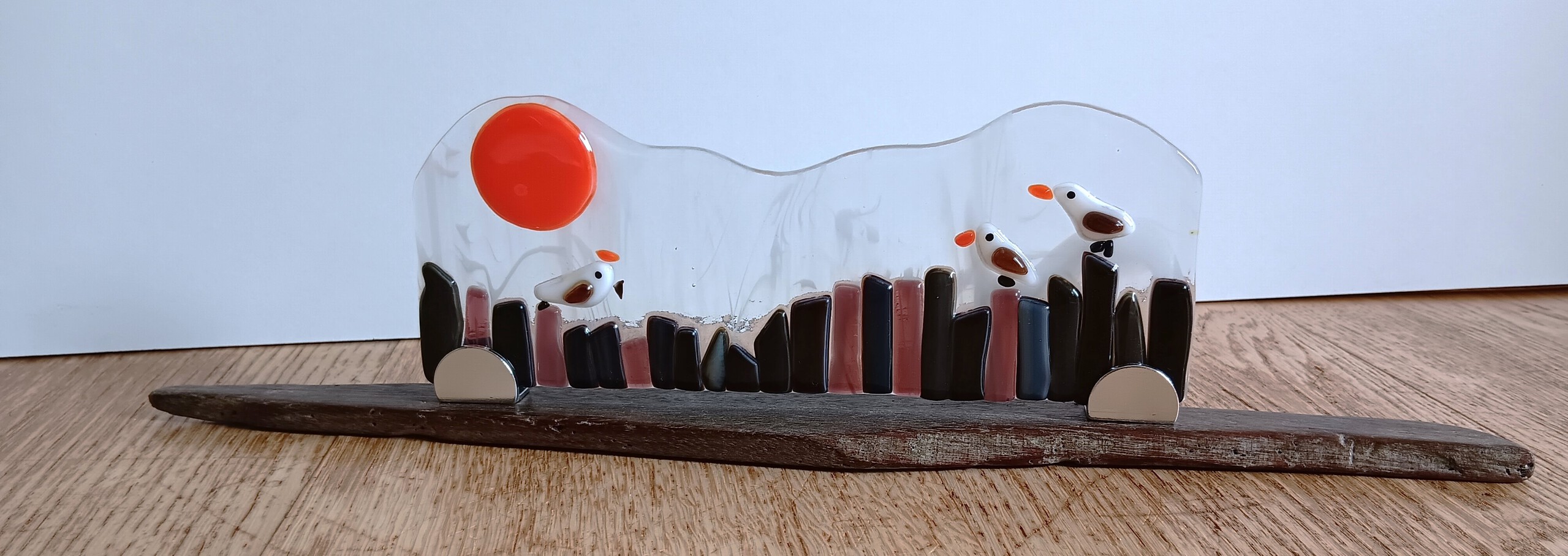 Een andere dag, die hebben we allemaal wel eens. Een gefused glazen zeegezicht met een twist voor een van de meeuwen. Met passie gemaakt door Ed.