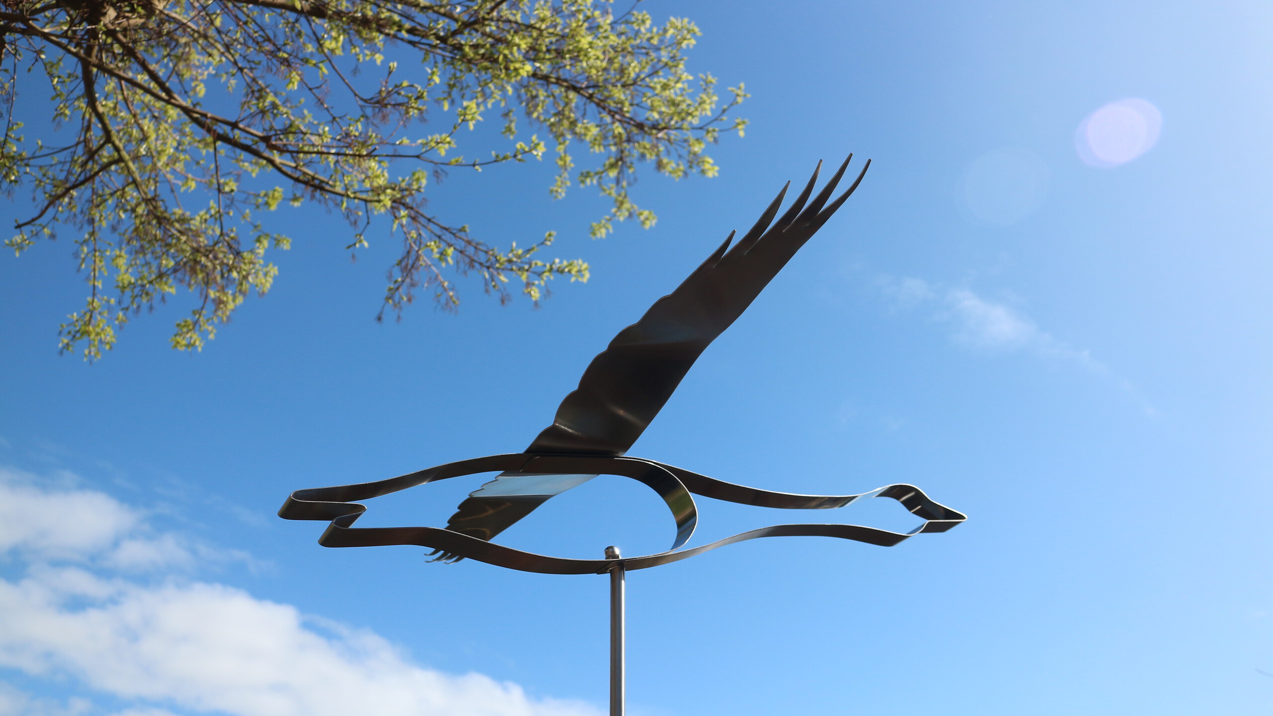 Vogels blijven mij interesseren. Zij lenen zicht uitstekend voor mijn werk met de RVS strips. Deze gans heeft weliswaar een gedetailleerde vleugel meegekregen, maar het lijf is minimalistisch opgebouwd. De sculptuur staat op een Douglas houten sokkel, die ondersteund word door een hardstenen tegel van ca 30 x 30 cm. De sokkel zelf is 76 cm hoog, de totale hoogte is 115 cm. Vleugelwijdte is 72 cm en de lengte van het lijf is 69 cm. Sculptuur en sokkel zijn los van elkaar te vervoeren. Uiteraard kan dit sculptuur tegen weer en wind.