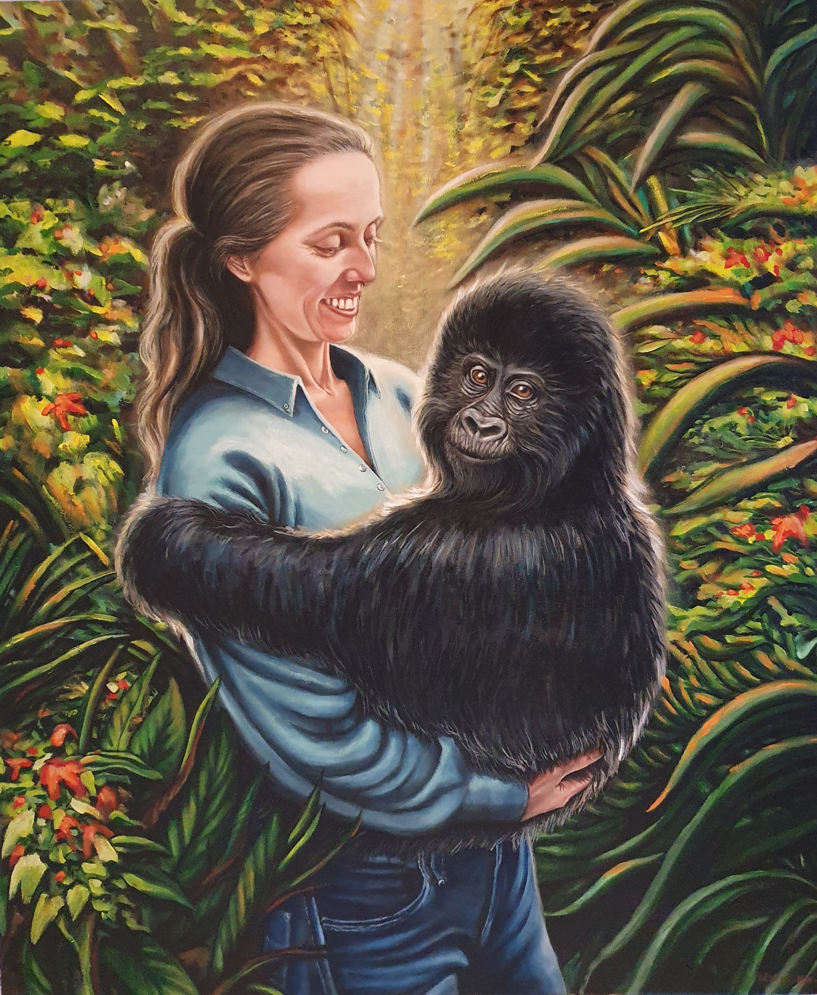 Dian Fossey (1932- 1985) was een Amerikaans etholoog en mammoloog die jarenlang gorillagroepen observeerde in de bergwouden van Rwanda. Ze trad voor haar onderzoek in intensief contact met de gorilla's, waarbij ze veel ontdekte over hun manier van communiceren. Vivi poseerde 'in de huid van Dian Fossey'.