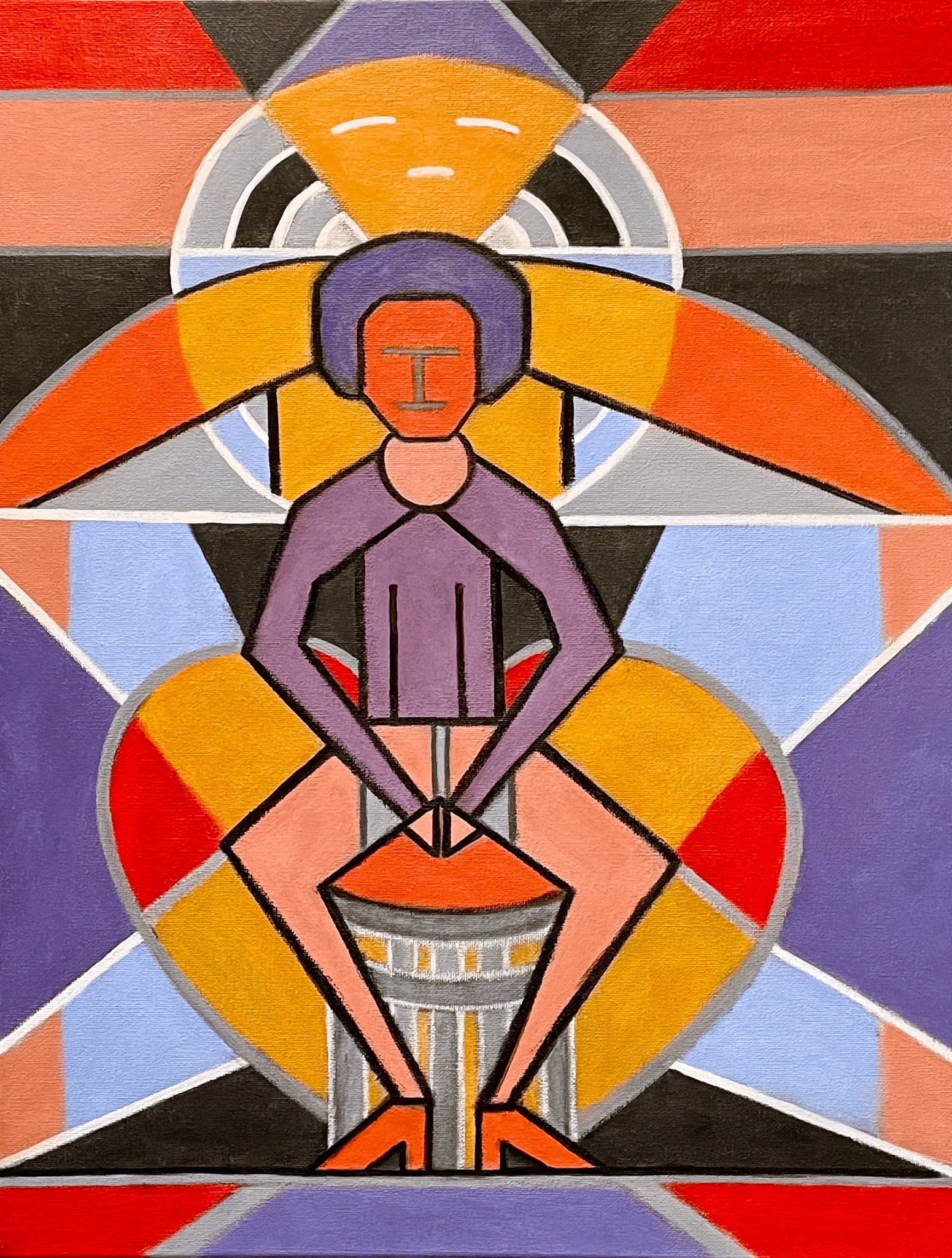 Een geometrische voorstelling van 4 figuren in 1 portret! Het begon met 1 persoon zittend op een kruk en tijdens het schilderproces ontstonden er nog 3 anderen in de tussenliggende ruimtes. Zie jij ze ook allemaal..?