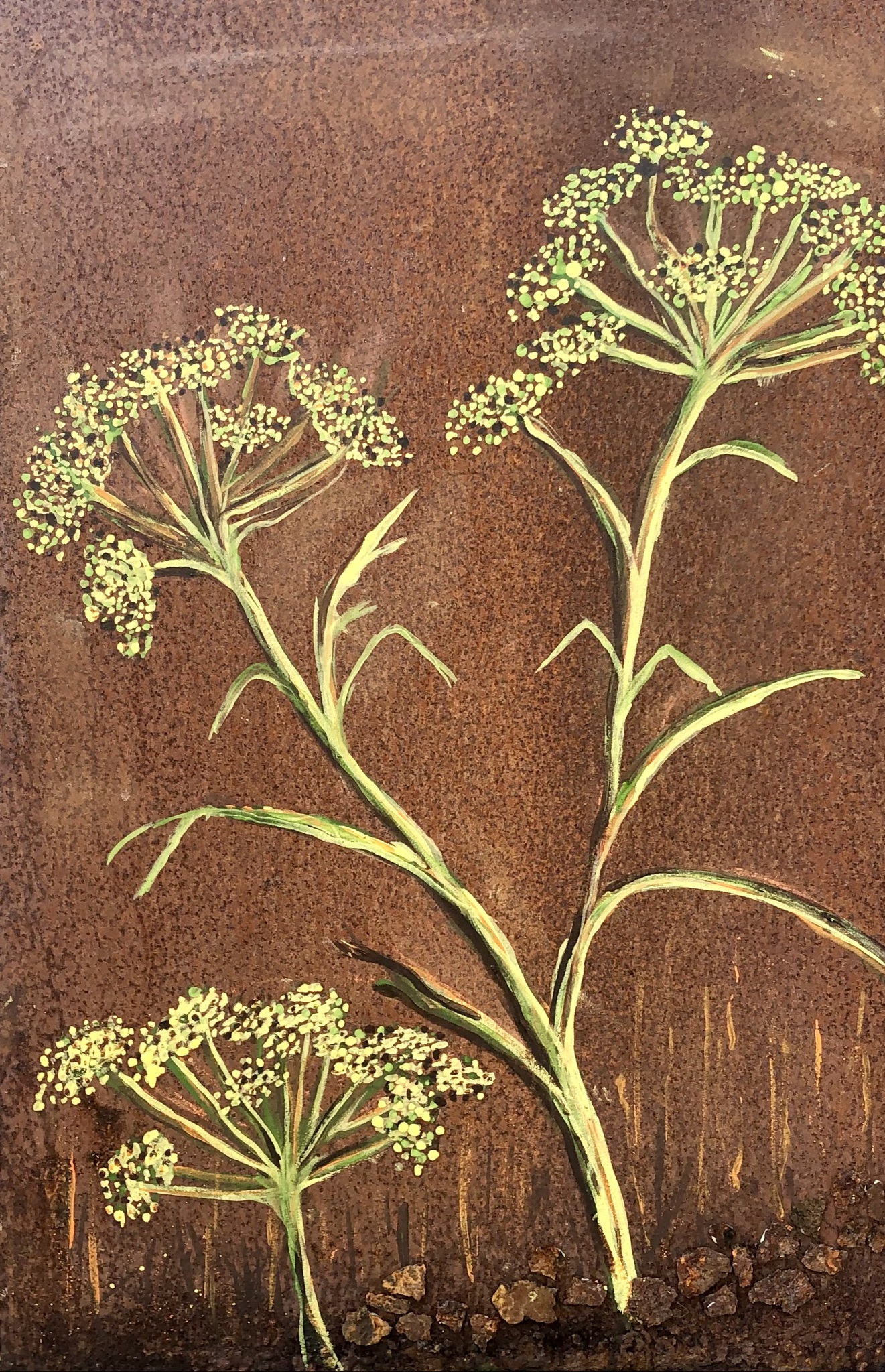Op een roestige plaat heb ik een schildering met olieverf gemaakt van de fragile dille. Een mooi contrast.